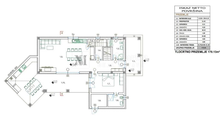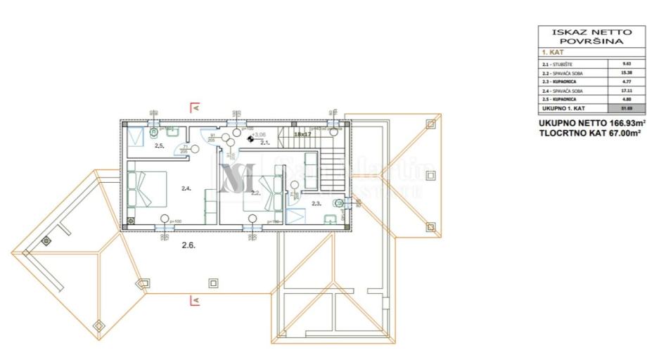 Ova kuća se prostire kroz 167 m2 stambene površine te je smještena na parceli od 764 m2, a prostire se kroz dvije etaže. U prizemlju nailazimo na ulazno predsoblje, dnevni dio sa kuhinjom i blagovaonicom u otvorenom konceptu, gdje se nalazi i izlaz na natkrivenu terasu, jedne spavaće sobe s vlastitom kupaonicom, spremišta, ostave te još jedne kupaonice. Unutrašnjim stepeništem se odlazi na kat gdje su još dvije spavaće sobe sa vlastitim kupaonicama.