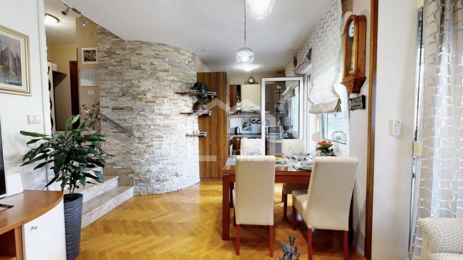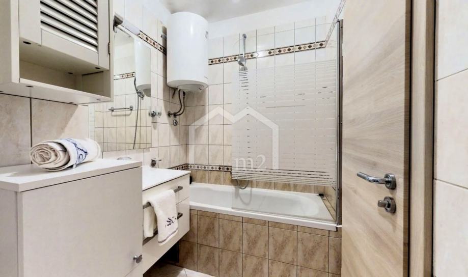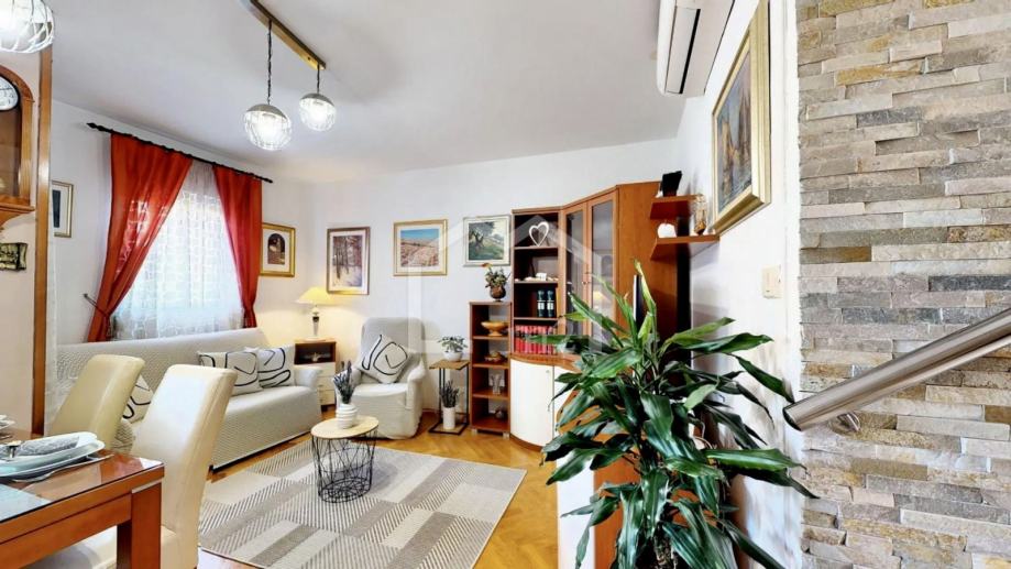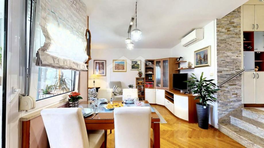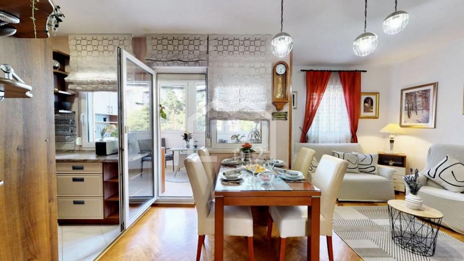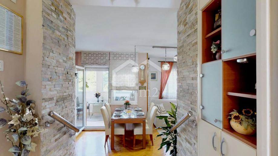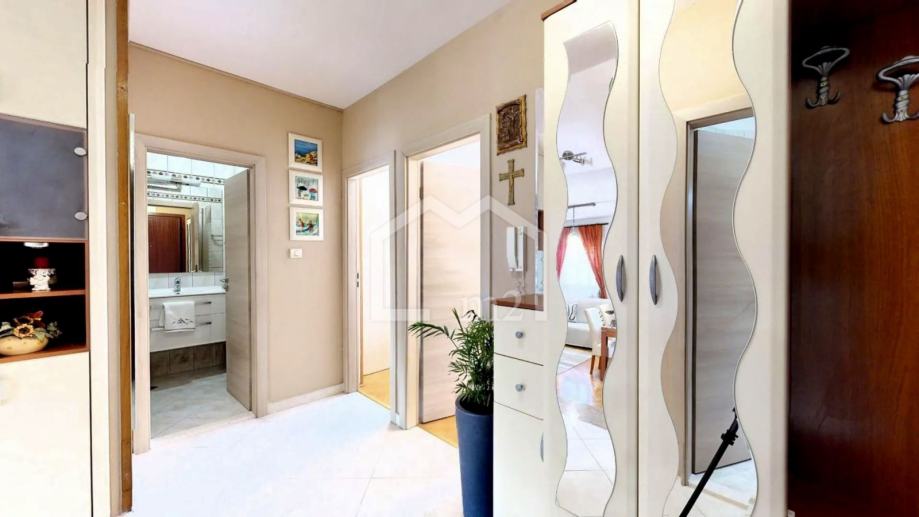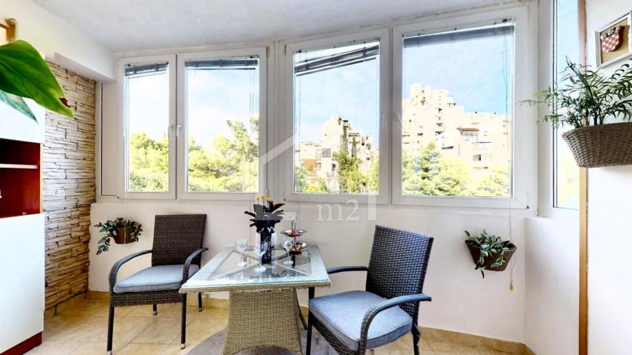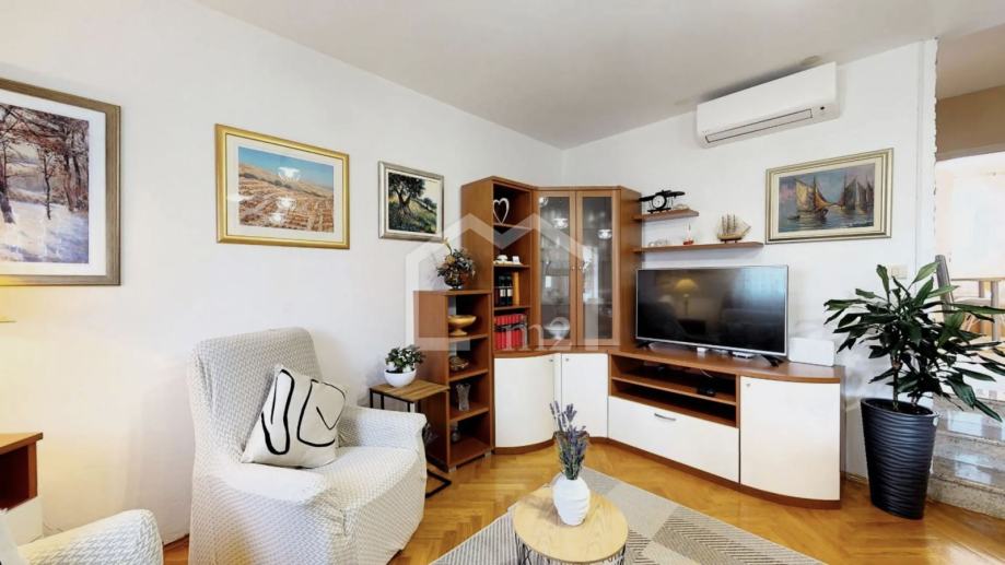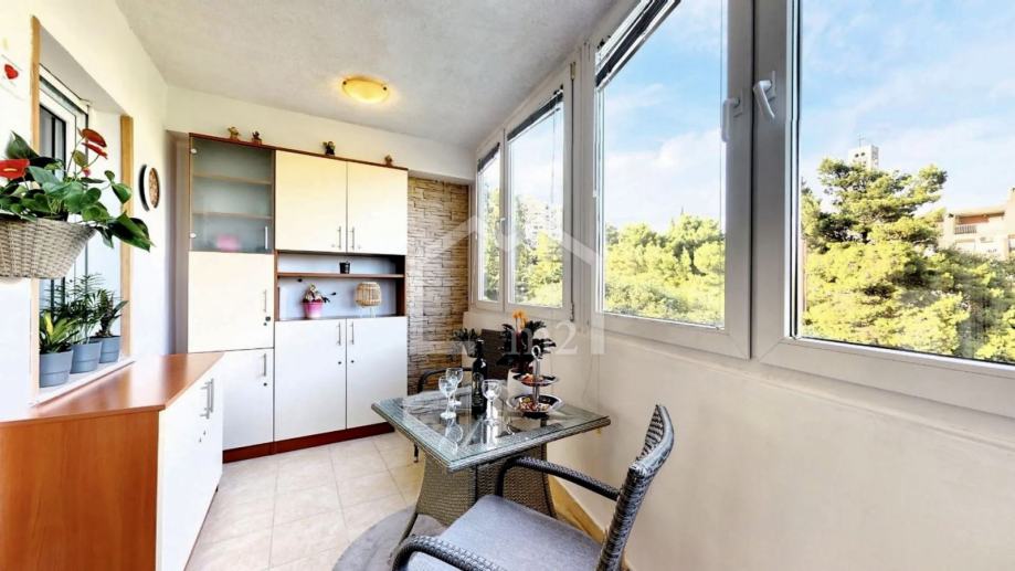 Iznajmljuje se dugoročno, komforan dvosoban stan na trećem katu stambene zgrade na Žnjanu. Sastoji se od ulaznog dijela, dvije spavaće sobe, kuhinje s blagovaonom, dvije kupaonice, dnevnog boravka iz kojeg se izlazi na veliku lođu koja je uređena i zatvorena te je možete koristiti tokom cijele godine. Sa lođe se pruža i pogled na more.