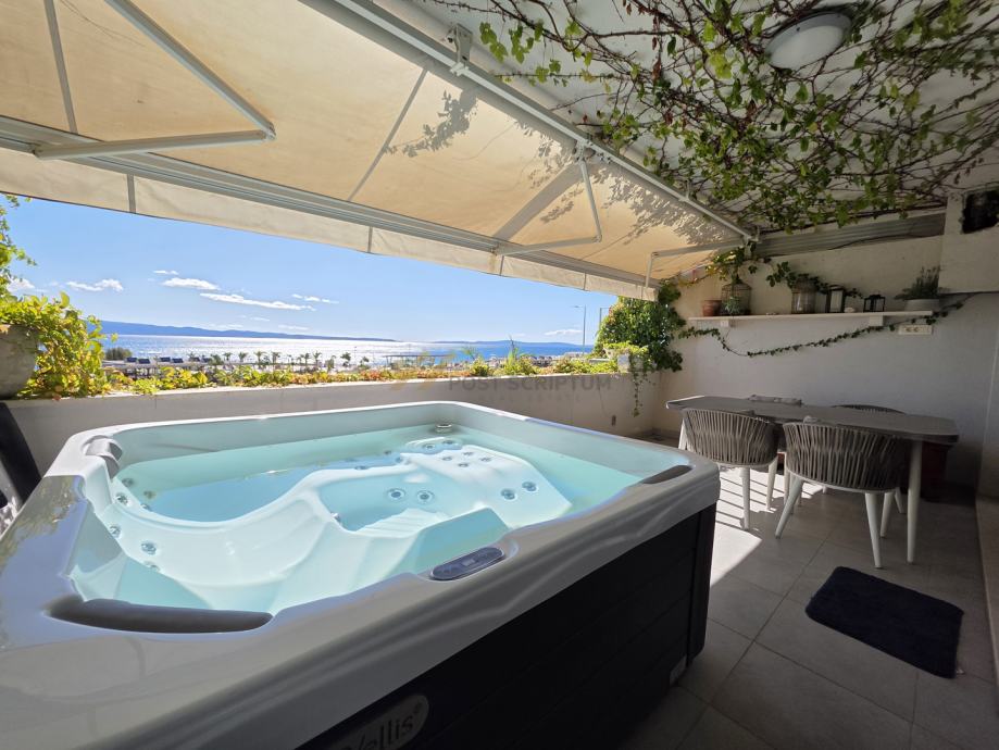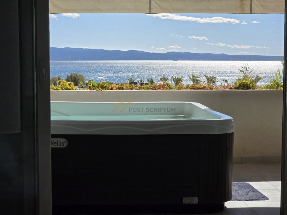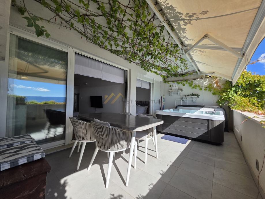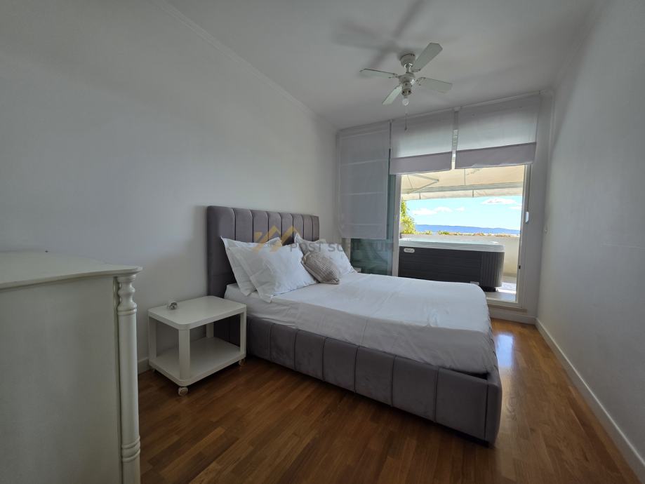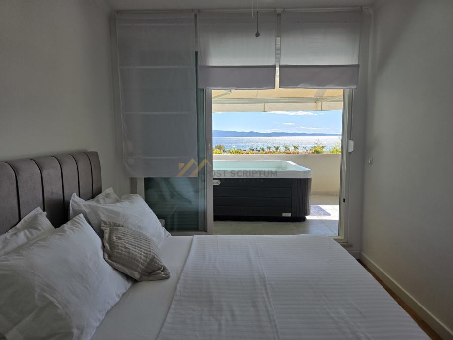 Sastoji se od kuhinje s blagavaonicom i dnevnim boravkom, spreme, spavaće sobe, hodnika, kupaonice i prostrane južne terase s masažnim jacuzzijem i otvorenim pogledom na more.