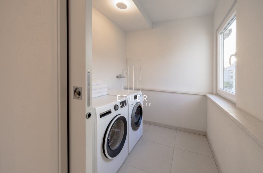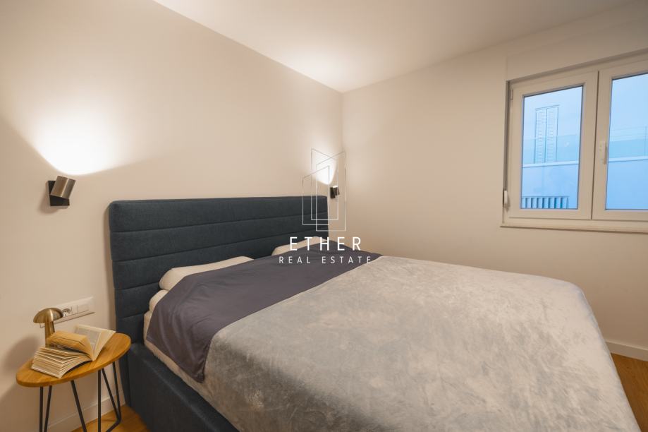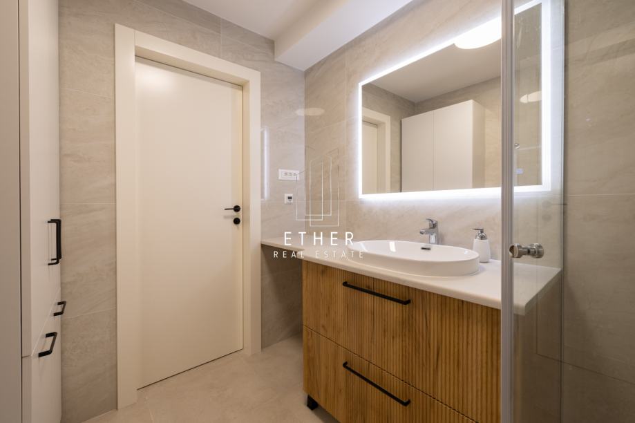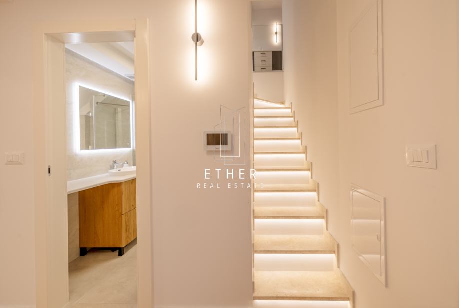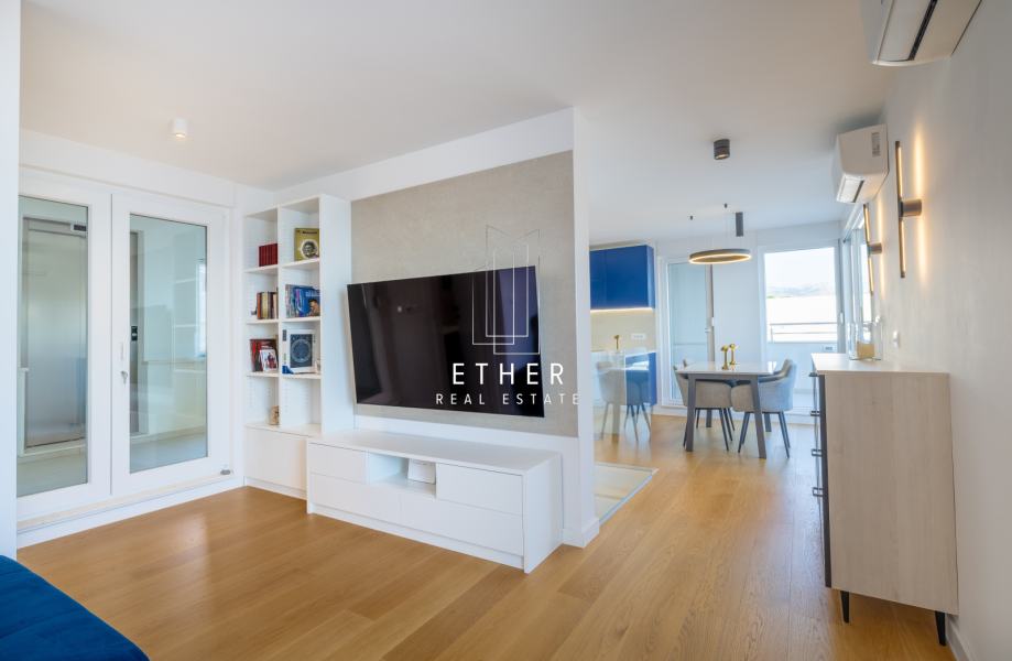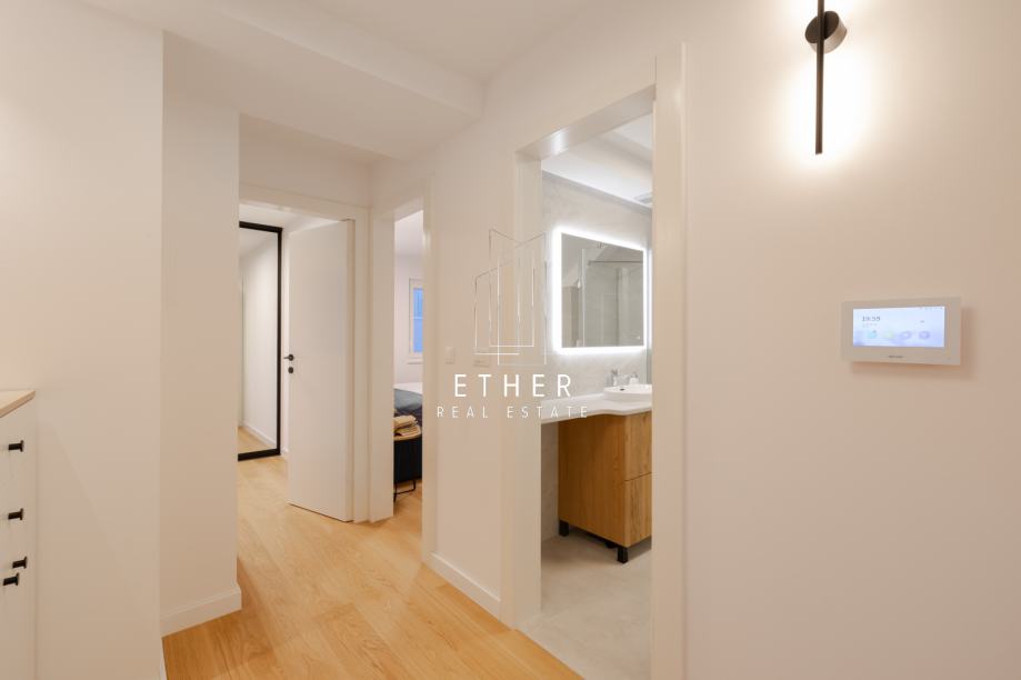 Klimatiziran, uvedeno podno grijanje u cijelom stanu, opremljen po mjeri izrađenim namještajem, premium uređajima i najkvalitetnijim sanitarijama, rasvjetom i prozorima.