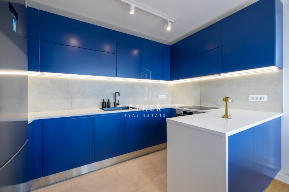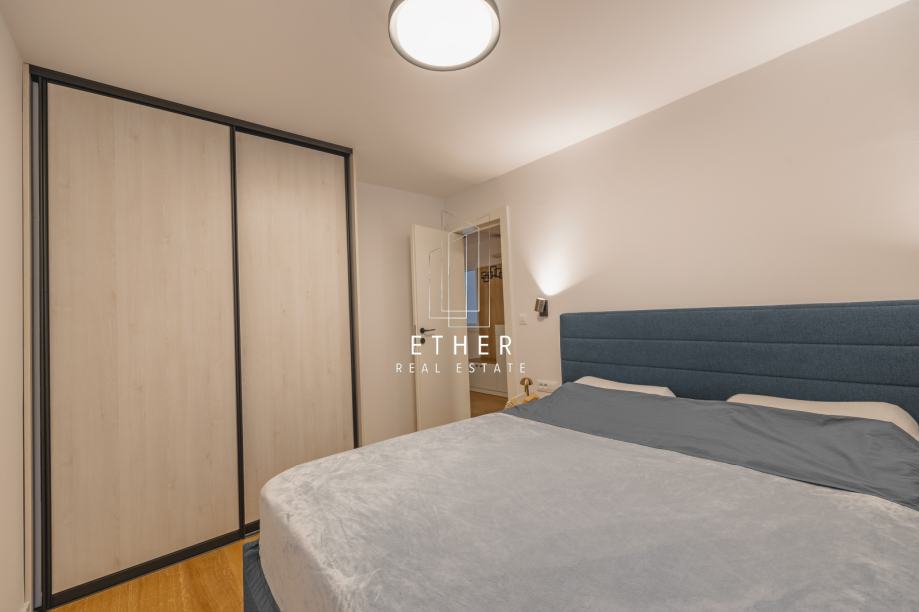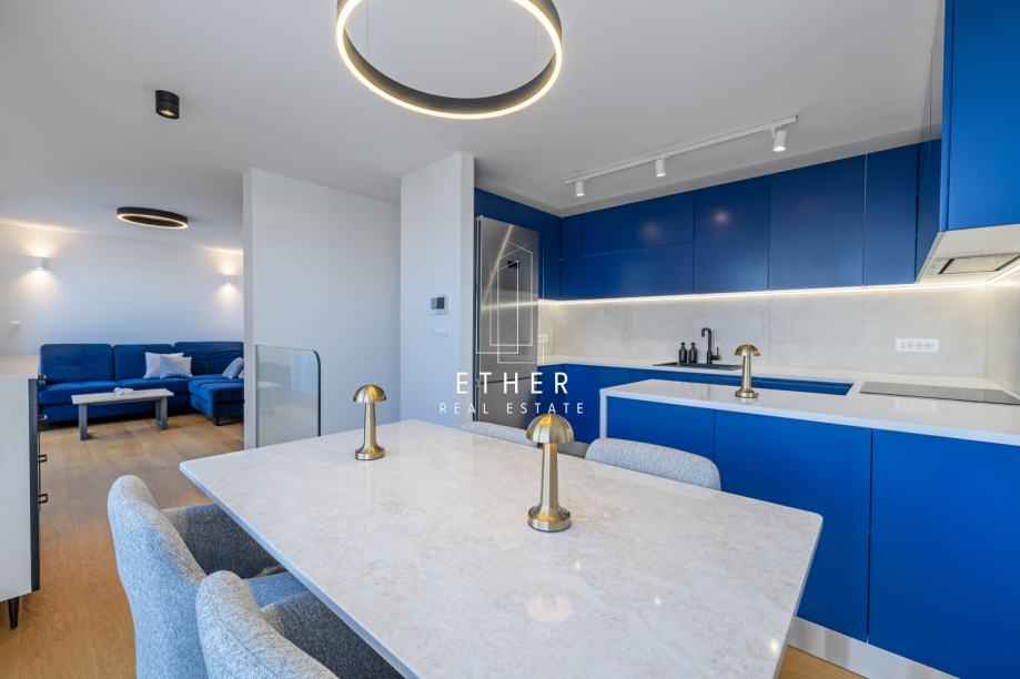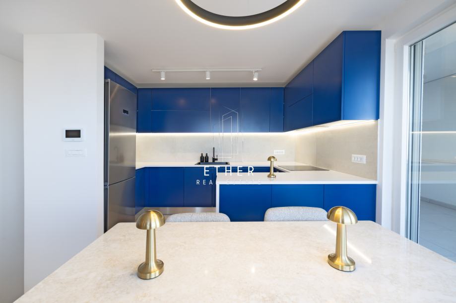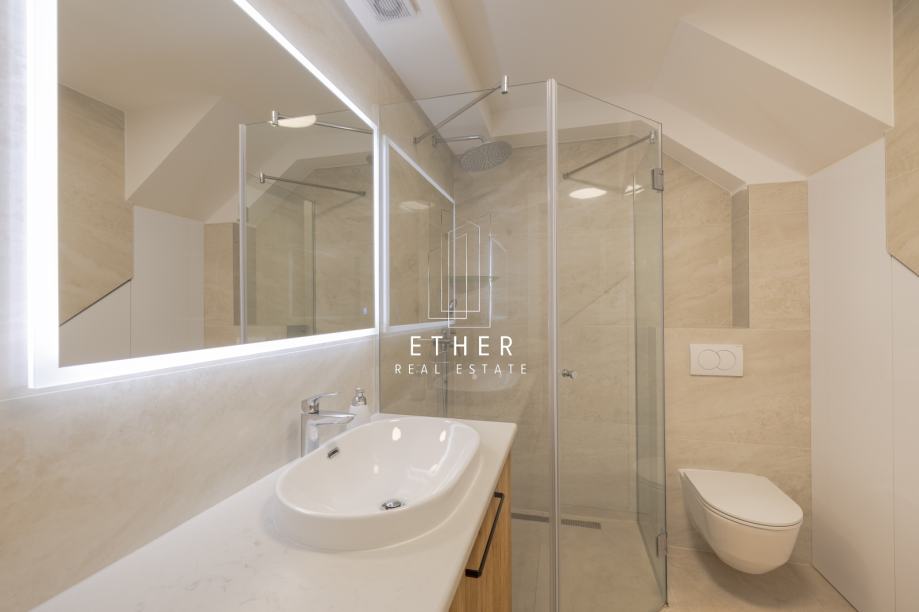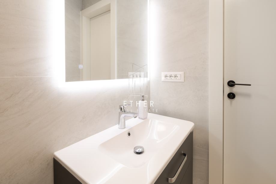 Klimatiziran, uvedeno podno grijanje u cijelom stanu, opremljen po mjeri izrađenim namještajem, premium uređajima i najkvalitetnijim sanitarijama, rasvjetom i prozorima.