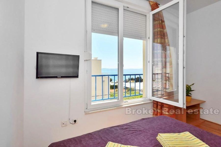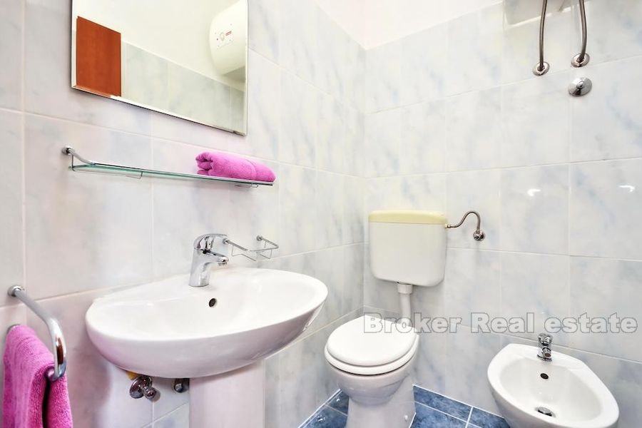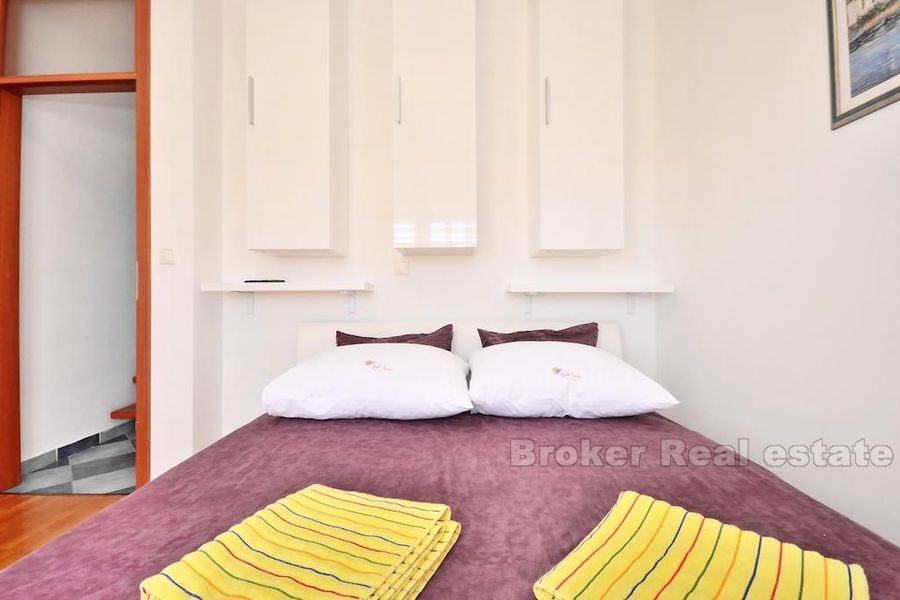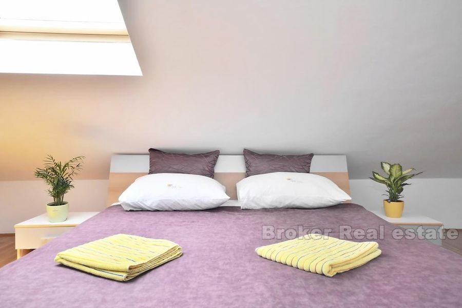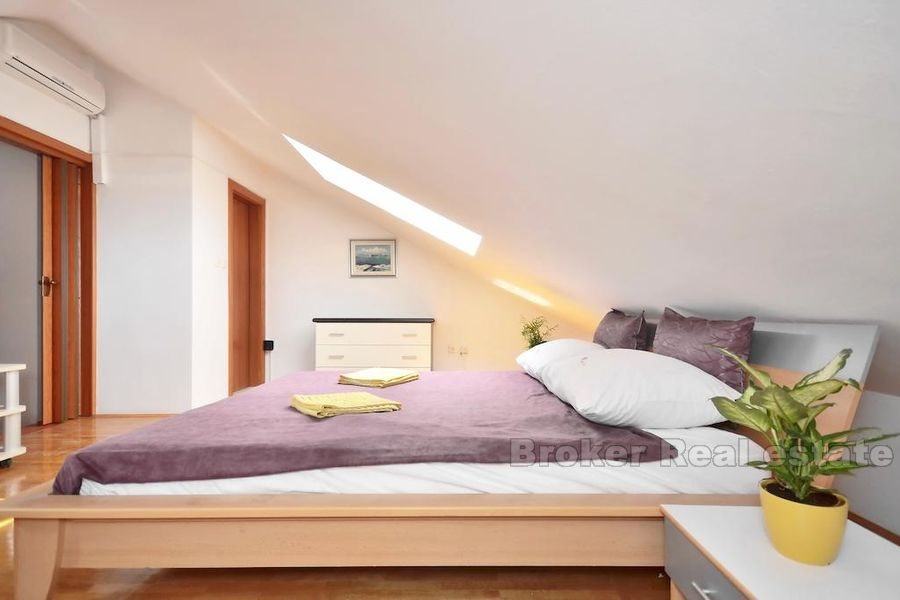 Potpuno namješten dvoetažni stan ( dvije sobe ) u novogradnji, na zadnjem, 3. katu, 100 metara od plaže, s prekrasnim pogledom, kompletno južno orijentiran, mirno okruženje, s vlastitim parking mjestom. Gornja etaža; spavaća soba i kupatilo, donja etaža; soba, kuhinja, dnevni boravak, veliko kupatilo, te balkon. Stan je na odličnoj lokaciji, sa svom infrastrukturom; kabelska, wireless net, perilice, klimatiziran, tv-dvd.
