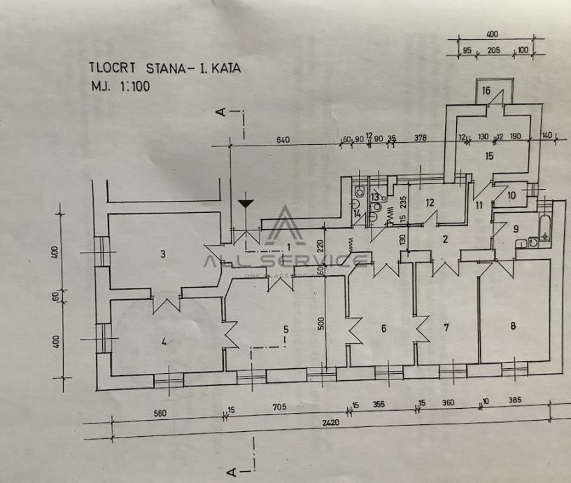 Stan se sastoji od prostranog hodnika,7 velikih prostorija,kuhinje,2 kupaone ,odvojenog wc-a i ostave.