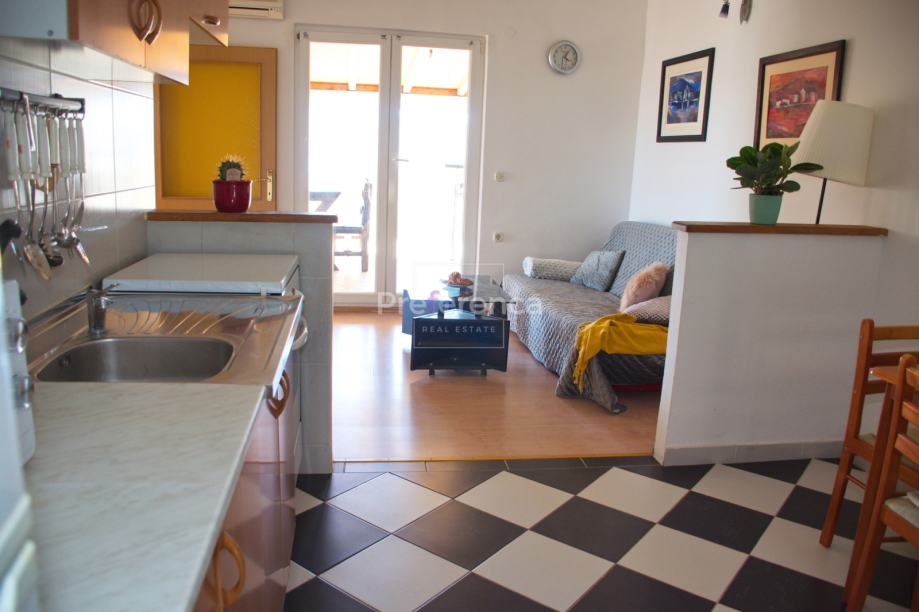 Stan se sastoji od hodnika, prostranog dnevnog boravka s kuhinjom i blagovaonicom, dvije spavaće sobe te kupaonice. Iz natkrivene zatvorene terase izlazi se na balkon s pogledom na more — idealno mjesto za opuštanje i uživanje u mirnom mediteranskom ugođaju.