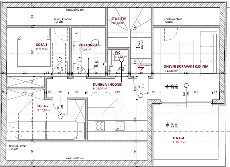 Ova nekretnina je osmišljena na način da može primiti i do deset gostiju u svakom trenutku, s obzirom da je predviđeno pet soba, tri kupaonice, toalet i terasa s pogledom. (Tlocrti priloženi)