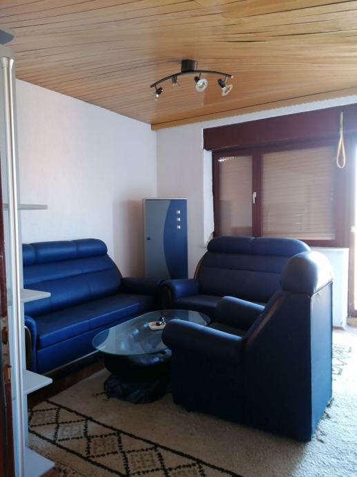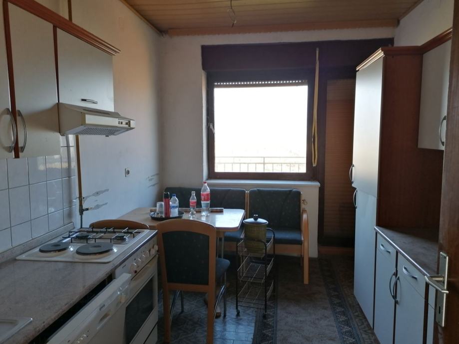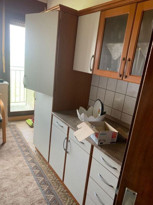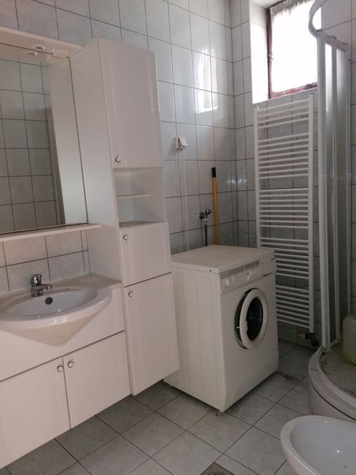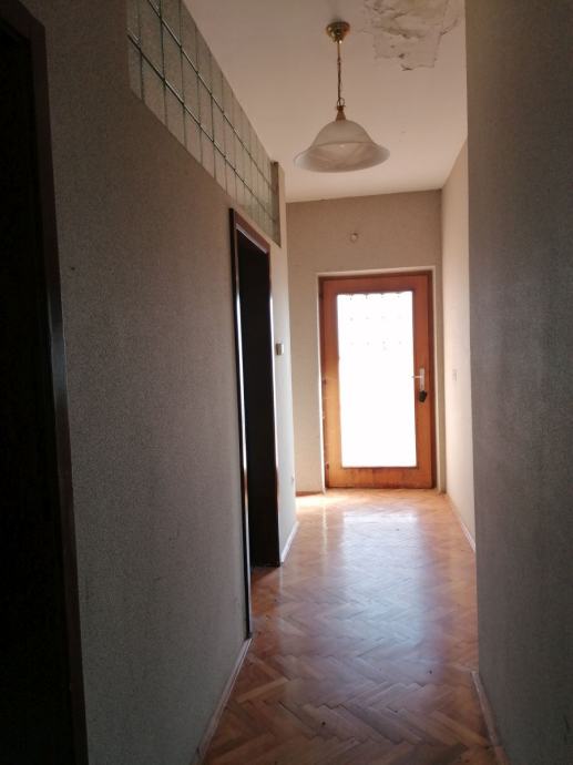 Trosoban stan smješten na prvom katu kuće. Stan ima poseban ulaz. Sastoji se od tri sobe, kupaonice, wc-a, kuhinje, hodnika i balkona. Ukupna površina stana je 73,58 m2 . Podovi su obloženi parketima i pločicama. Stan se prodaje namješten.