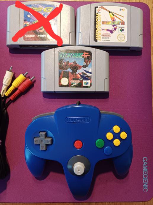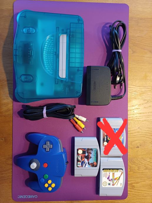 Dolazi sa originalnim plavim kontrolerom (nova gamecube gljivica - bolja od originalne), pripadajucim kablovima i 2 igre: Lylat Wars i Winter Olympics 98.