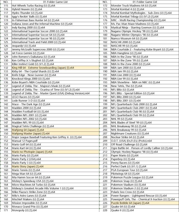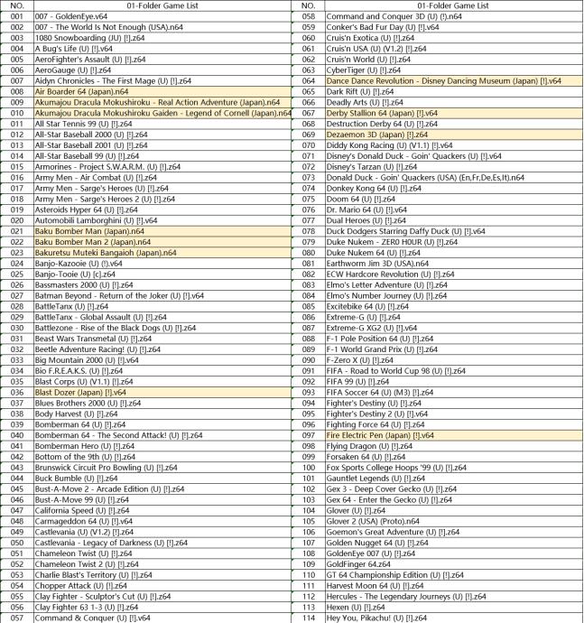Sadrži preko 340 različitih igara bez ponavljanja, od najpopularnijih: Legend of Zelda, Super Mario 64, Super Smash Bros., Mario Kart 64, Mario Party, Mega man 64, Pokemon Snap i Stadium, Golden Eye, Bomberman, Castlevania, F-zero X, Harvest Moon, Kirby, Turok itd.