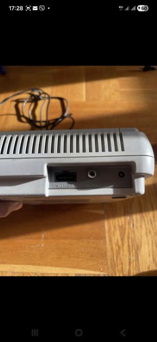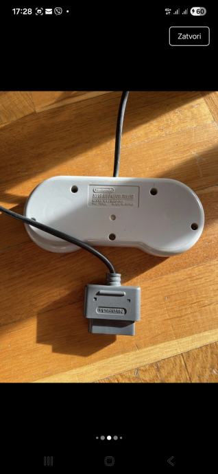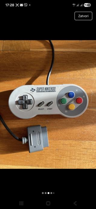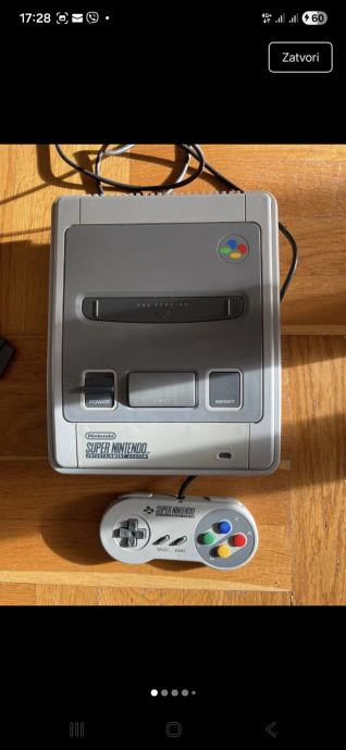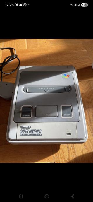Prodajem Super Nintendo (SNES) konzolu u setu s jednim kontrolerom. Konzola je sive boje, klasičnog dizajna karakterističnog za europsku verziju SNES-a. U kompletu dolazi originalni Nintendo kontroler s prepoznatljivim šarenim tipkama (A, B, X, Y) te d-padom.