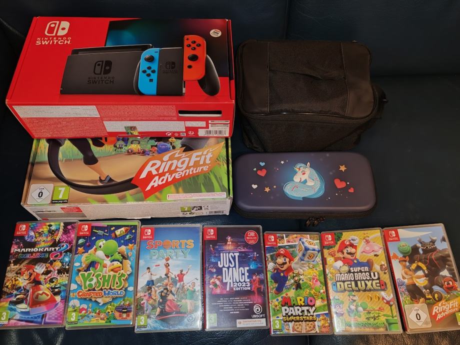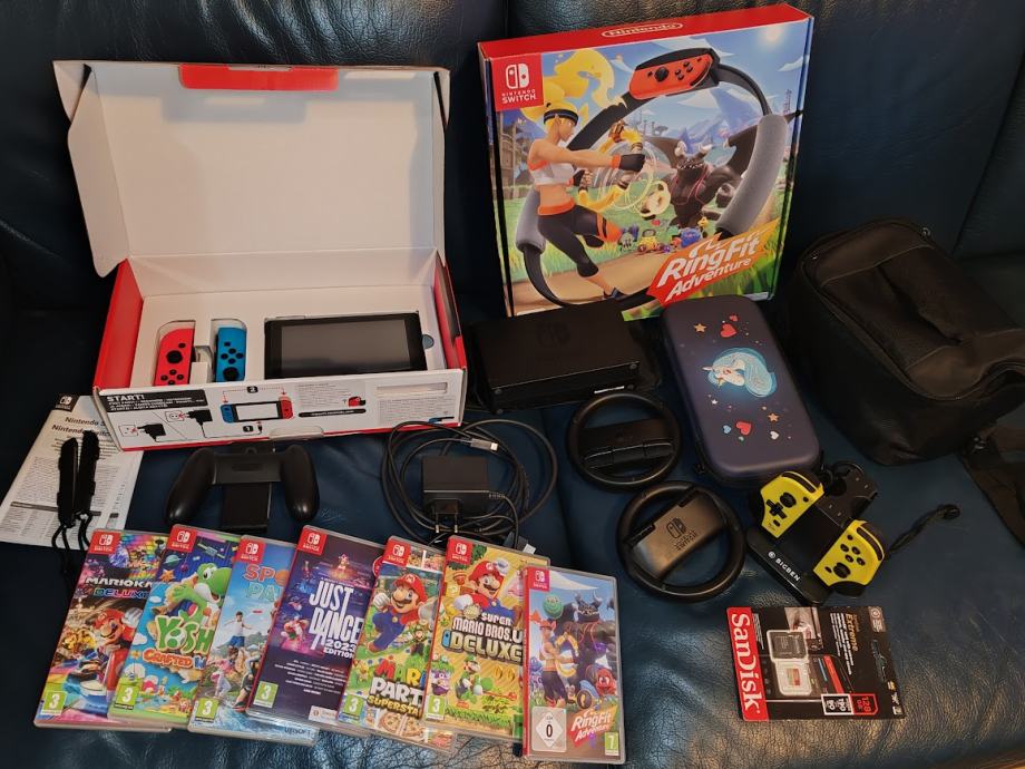 Nintendo Switch , 128 SD kartica, 7 igara , ring fit, dodatna oprema
