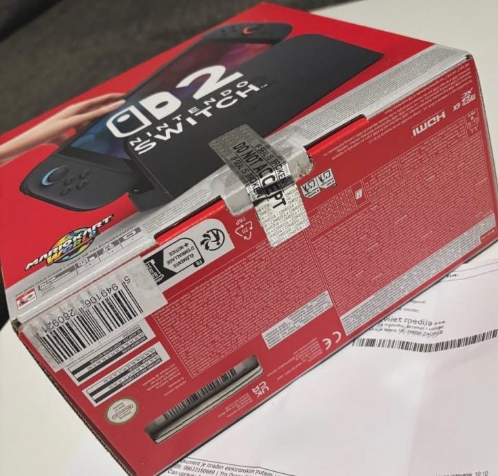 Prodajem potpuno nov, nekorišten i originalno zapakiran Nintendo Switch 2 s crveno-plavim Joy-Con kontrolerima.