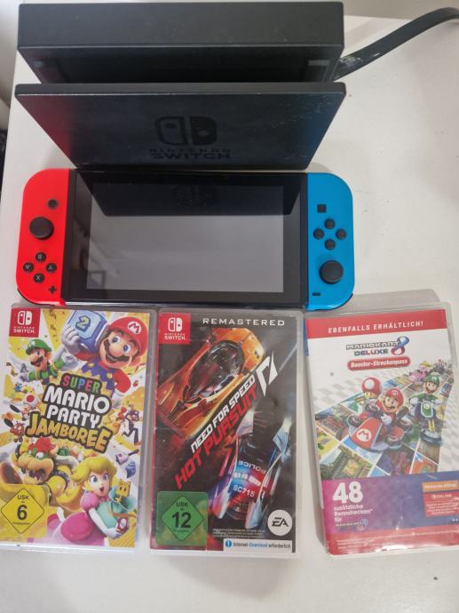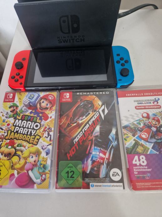 Nintendo Switch (s crveno-plavim Joy-Con kontrolerima) + Igre+ konzola za spajanje na TV- SVE U KOMPLETU!