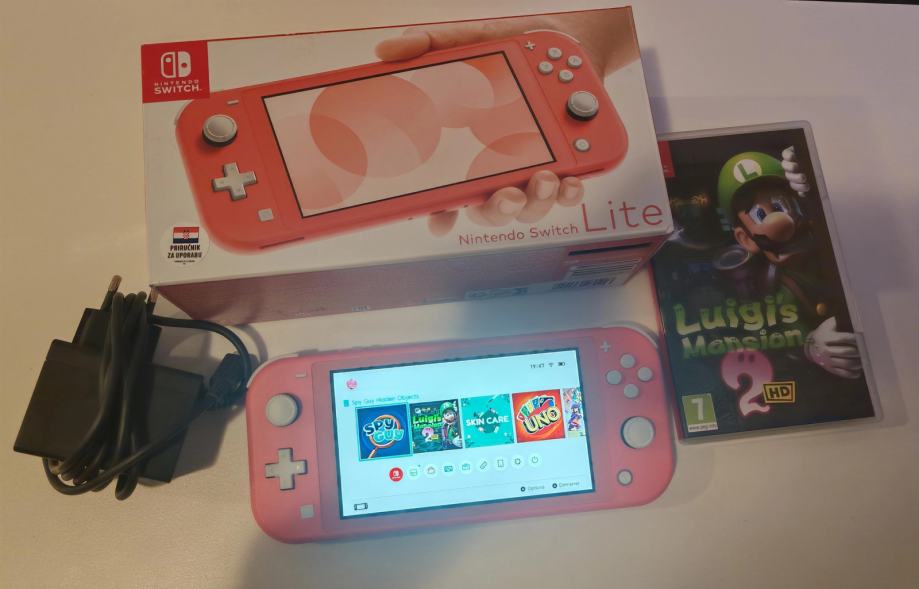 Konzola Nintendo Switch Lite Coral boje, kao nova, jako malo korištena. Uz nju igra Luigi's Mansion 2.