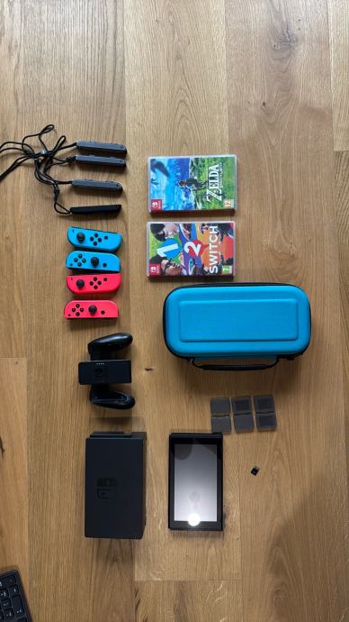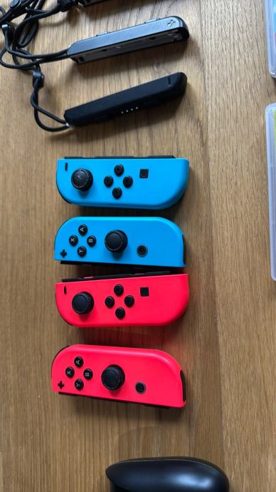 • Četiri Joy‑Con kontrolera (dva para, crveno/plavi i dodatni par) + Joy‑Con držač (grip) za igranje kao klasičnim kontrolerom.