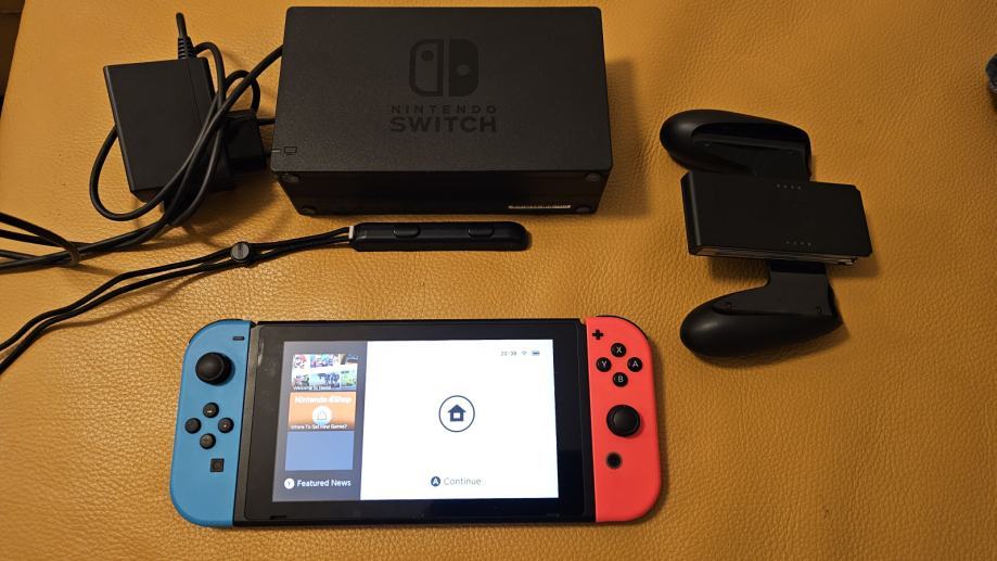 Uređaj dolazi sa 2 joycona (crvenim i plavim), dockingom, punjačem i kablovima