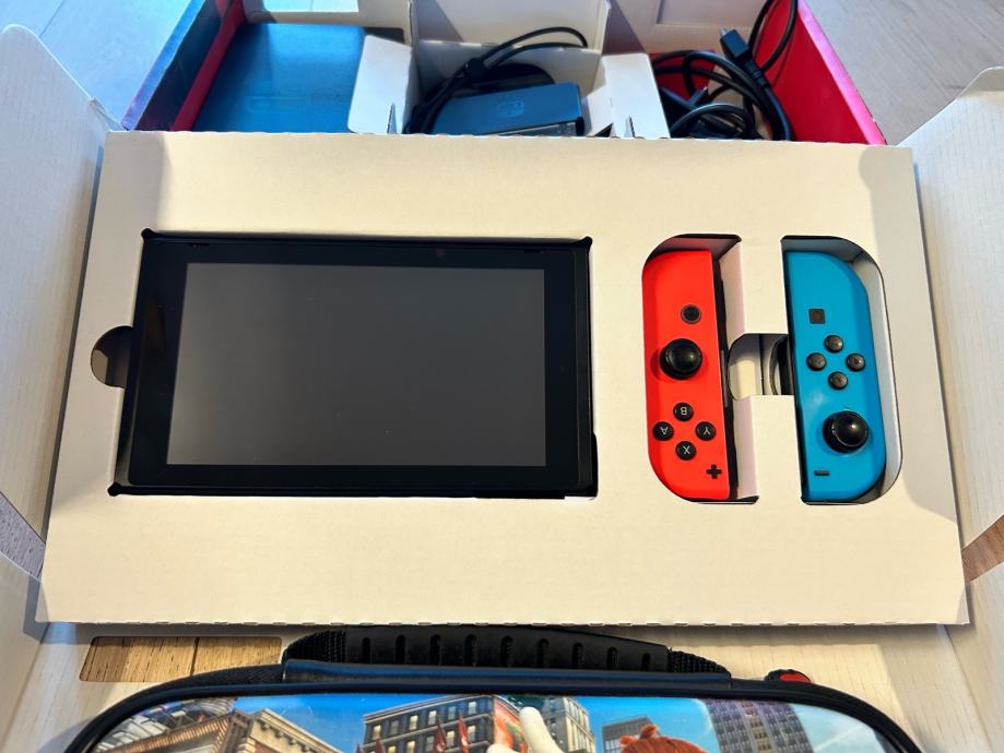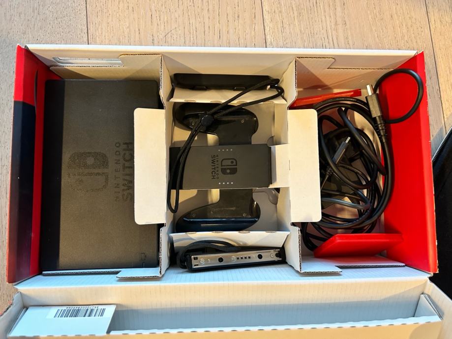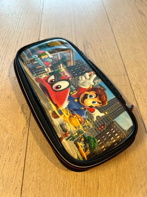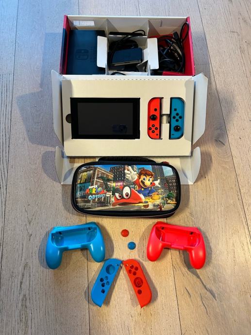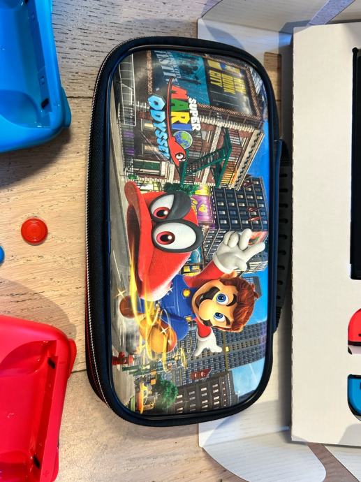 Sa originalnim dodacima (Dock statioton, HDMI kabel, punjač, joy-conovi) i dodatnom zaštitom za kontrolere, gripom, orinalna Super Mario Odyssey torbica.