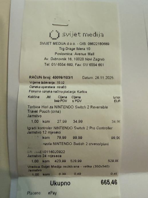 Prodajem Nintendo Switch 2 konzolu u crvenoj/plavoj boji, kupljenu u Svijet Medija. Uz konzolu dolazi kompletan sadržaj originalnog pakiranja. Prema računu, konzola je kupljena 26. studenog 2025. uz jamstvo od 24 mjeseca. Stanje kao novo.