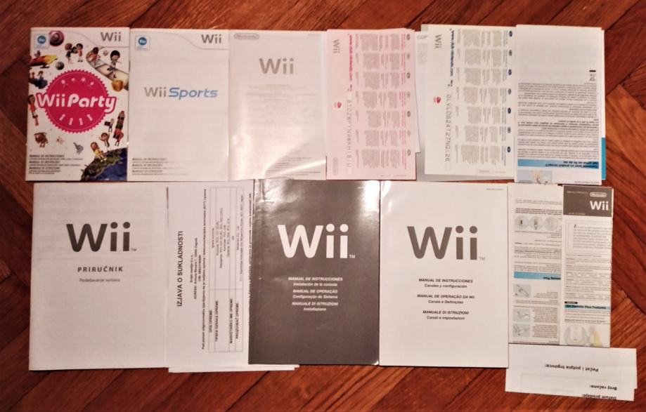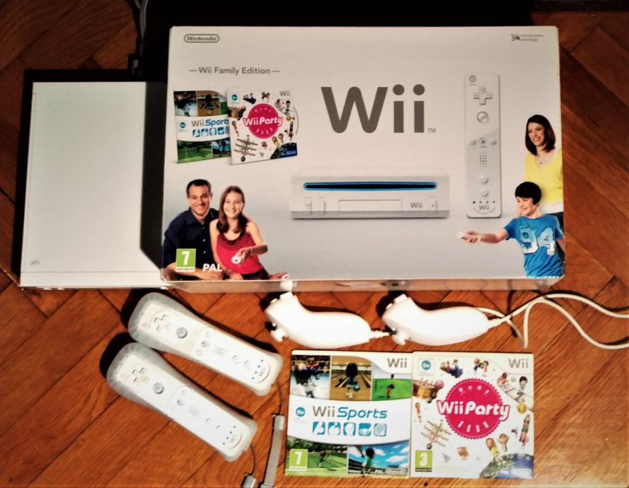 Uz konzolu idu svi priključci ( odmah spremna za igranje ), 2 daljinska upravljača, 2 Nunchack kontrolera i 2 original Family Edition igrice ( Wii Sports i Wii Party )