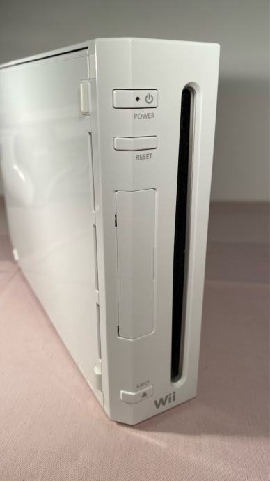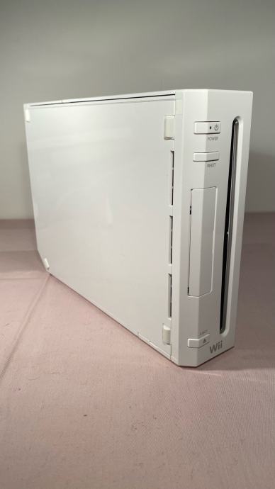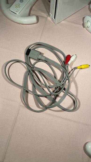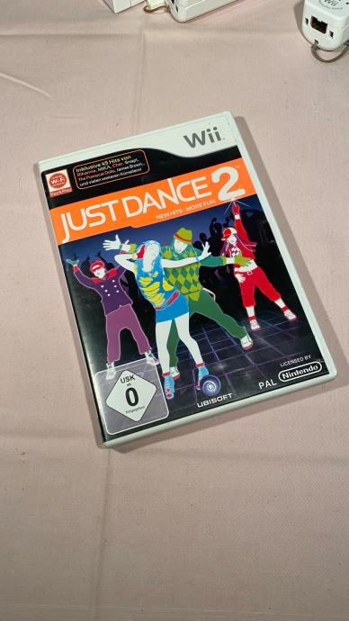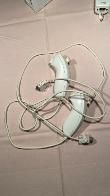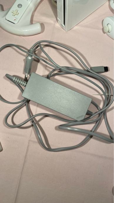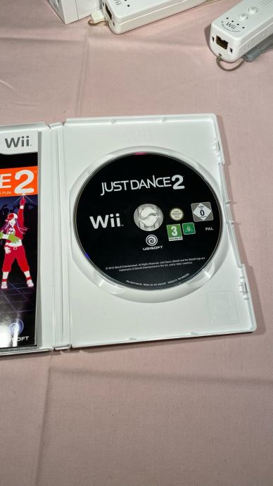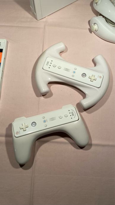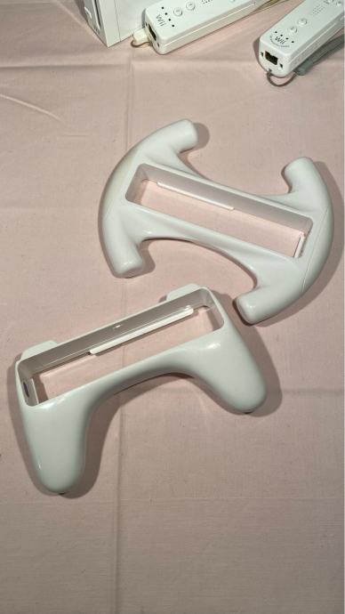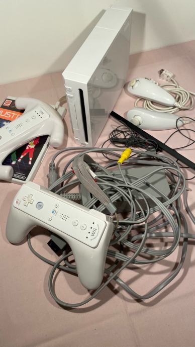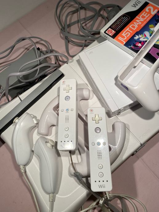 •bijeli Nintendo Wii, Wii Remote, Wii Remote Plus, 2x Wii Nunchuk, Wii Balance Board, Wii Hand Grip Pad, Wii Half-Wheel, Wii Sensor Bar, Just Dance 2 igra, napajanje, AV kabel