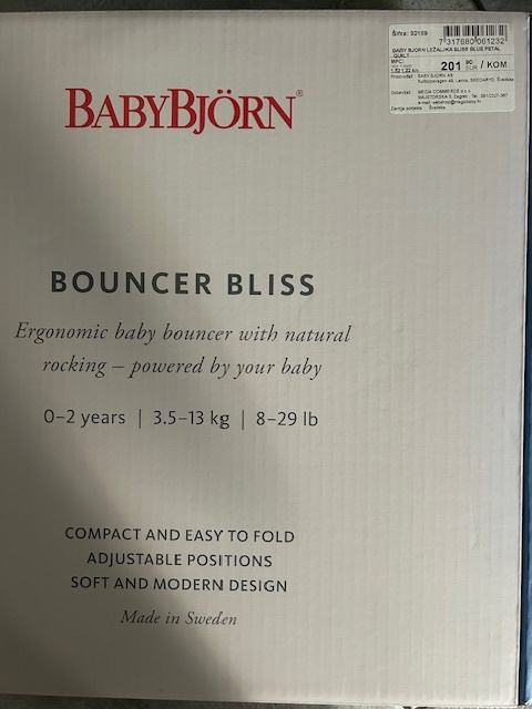 BabyBjörn Ležaljka Bliss je ergonomska, sklopiva ležaljka za bebe od rođenja do cca 24 mjeseca (3,5 - 13 kg). Nudi prirodno ljuljanje bez baterija, više položaja za igru, odmor i spavanje te se kasnije može koristiti kao dječji stolac. Izrađena je od 100% pamuka s Öko-Tex Standard 100, klasa 1 certifikatom, a navlaka se lako skida i pere u perilici na 40 °C.