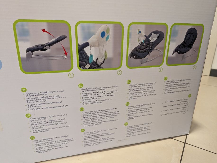 Sigurnosni pojas u tri točke. Funkcija nježnog vibriranja, luk s igračkama, šest zvukova prirode i šest melodija. Skidiv luk s igračkama koji se može upotrebljavati odvojeno, npr. na krevetiću ili vrtiću. Četiri položaja nagiba primjerena za djecu težine do 18 kg.