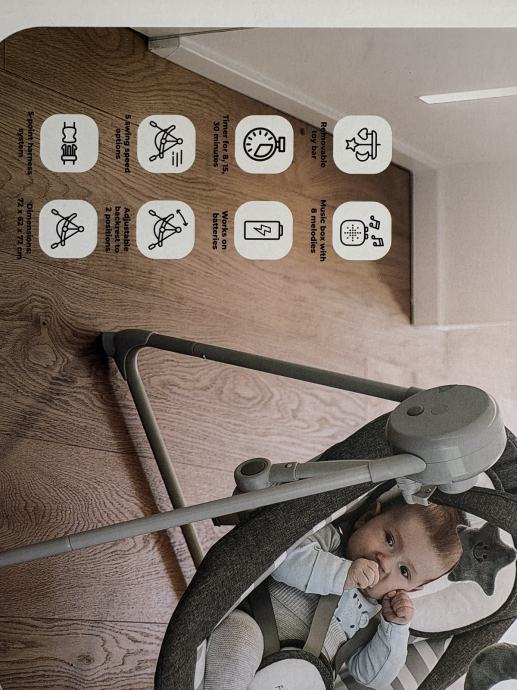 Snuggy ima luk za igranje s dvije igračke koje potiču motorički razvoj vaše bebe. Ljuljačka je također opremljena 5-točkovnim sigurnosnim pojasom koji se lako podešava. Tako će vaš mališan biti sigurno i udobno smješten u ljuljački, gdje se može zabavljati ili udobno odmarati.