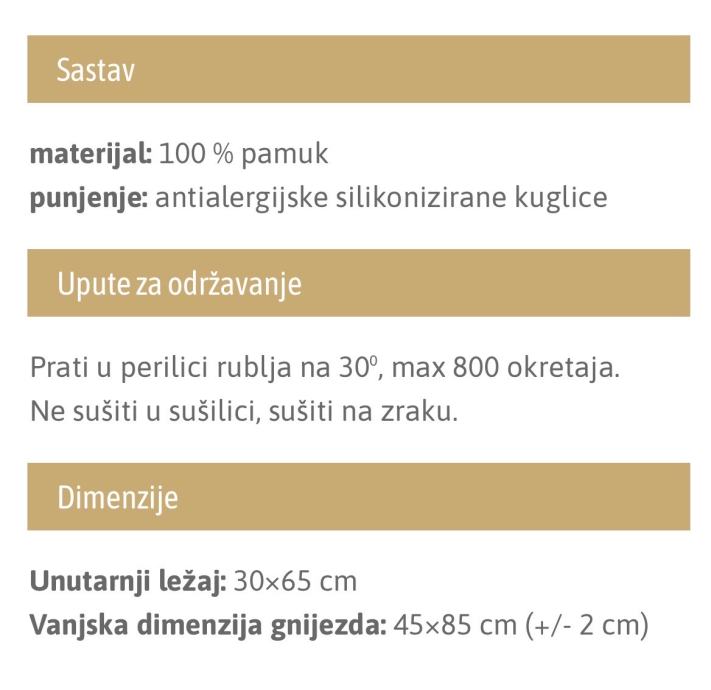 Gnijezdo za bebe ručno je izađeno je od najfinijih pamučnih tkanina s OEKO-TEX 100 class I certifikatom. Obruč gnijezda punjen je antialergijskim silikoniziranim kuglicama. Gnijezdo olakšava život roditeljima i omogućuje miran i siguran san Vašoj bebi.