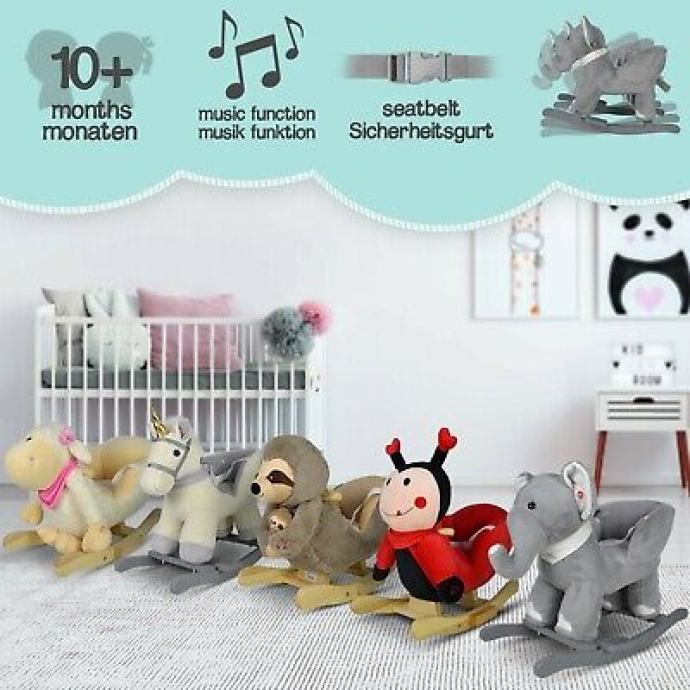 Infantastic® životinja za ljuljanje - plišana, od 1 godine, za bebe i djecu, slon / jednorog / ljenjivca / bubamara / ovca, s pojasom, glazbom, ručkom, osloncem za noge - stolica za ljuljanje, igračka za ljuljanje, konjić za ljuljanje. Naša mala igračka za ljuljanje savršen je pratilac za vaše dijete koje voli životinje i njihovo putovanje .