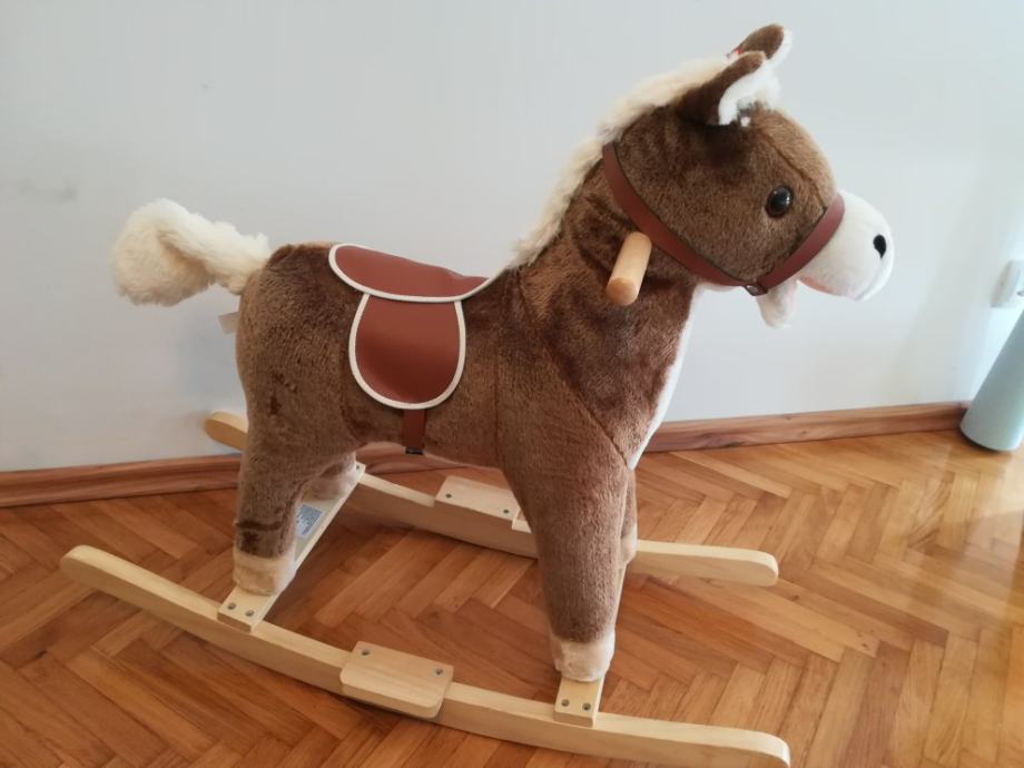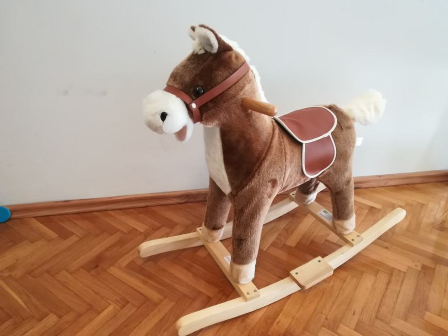 Preslatki konjic za njihanje, pritiskom na jedno uho rze, pritiskom na drugo ide muzika i konjic otvara usta i mase repom.