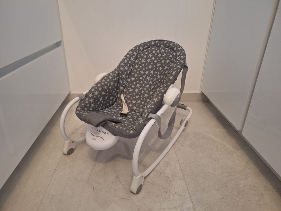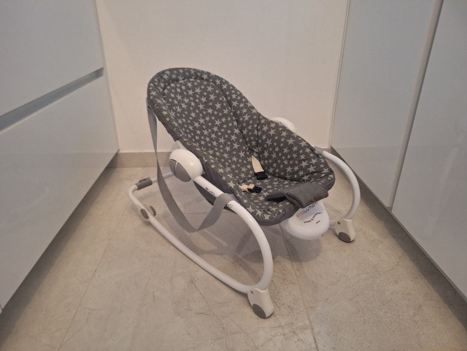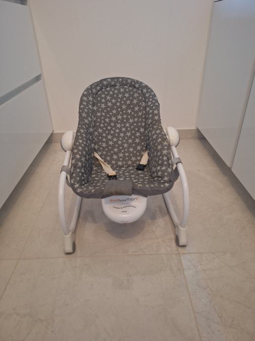 Ležaljka za ljuljanje i stolica za starije dijete. Od rođenja do 36 mjeseci. Sadrži luk s mekanim i perivim igračkama. Kompaktna i sklopiva. Regulacija nagiba za leđa i nožice u tri razine. Periva, punjena navlaka za optimalnu udobnost. Vibracije i glazba (dvije melodije) - dvije baterije dolaze u pakiranju.