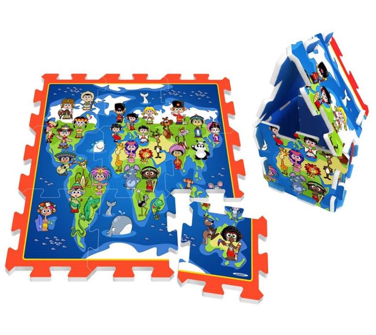Karta svijeta od pjene savršen je način da se djeca istovremeno zabave i uče. Paket sadrži 9 velikih, mekanih elemenata koji prikazuju kartu svijeta, djecu i životinje iz raznih dijelova svijeta. Zahvaljujući tome, dijete može od ranog vremena učiti o zemljopisu i raznolikosti našega svijeta. Slagalice od pjene izvrsne su kvalitete i prije svega su sigurne za vaše dijete.