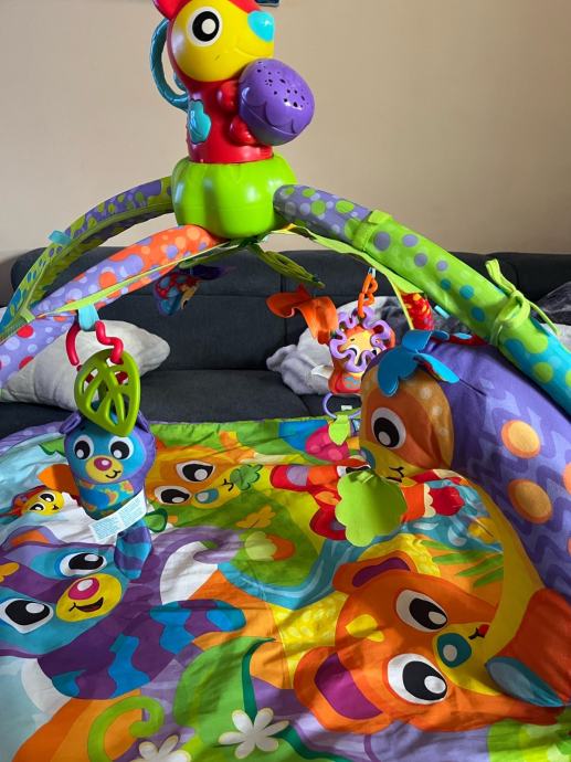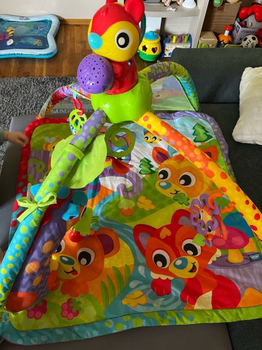 Šarena podloga za igru sa lukom na kojem su obješene igračke stimulira vizualna i slušna osjetila, potiče dijete na promatranje, prepoznavanje i razvijanje motoričkih sposobnosti. Odvojiva noćna svjetiljka u liku vjeverice može se koristiti i kraj krevetića, sa uspavljujućim svjetlima i glazbom. Plišani jelen se također može odvojiti, kao i igračke s luka. Viseće igračke: ogledalo, jabuka zvečka, rakun , medo s prstenom i 2 mekana grizala