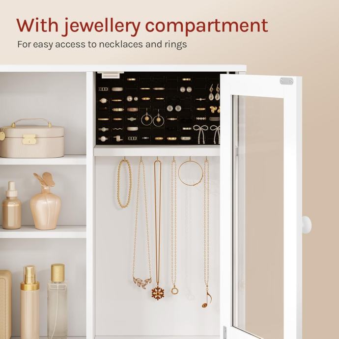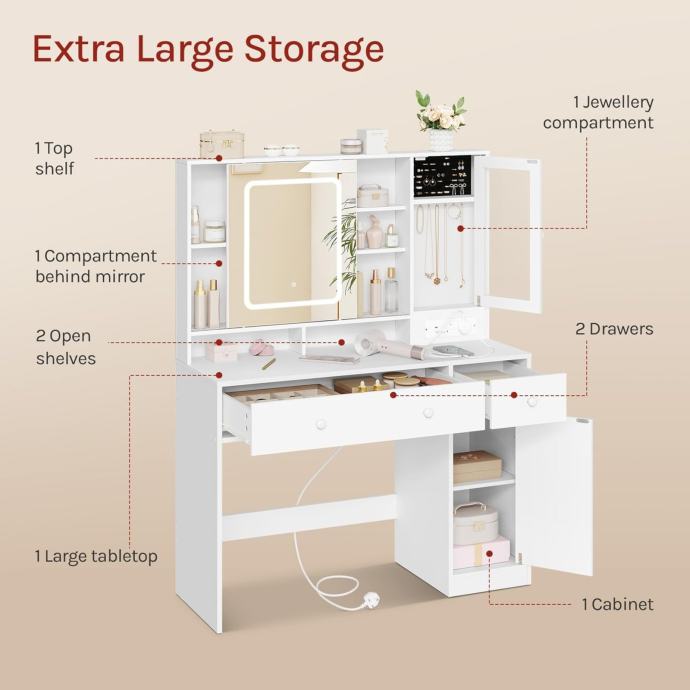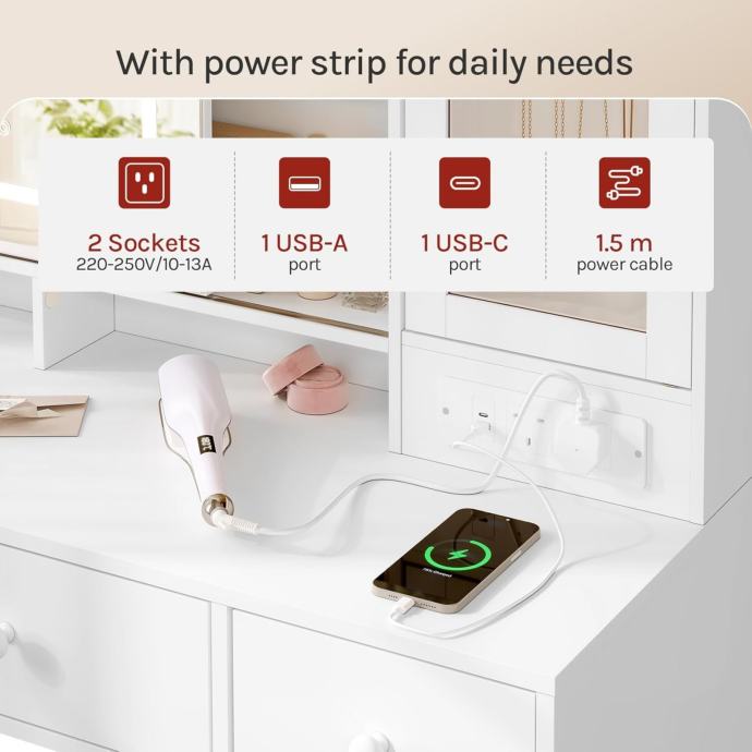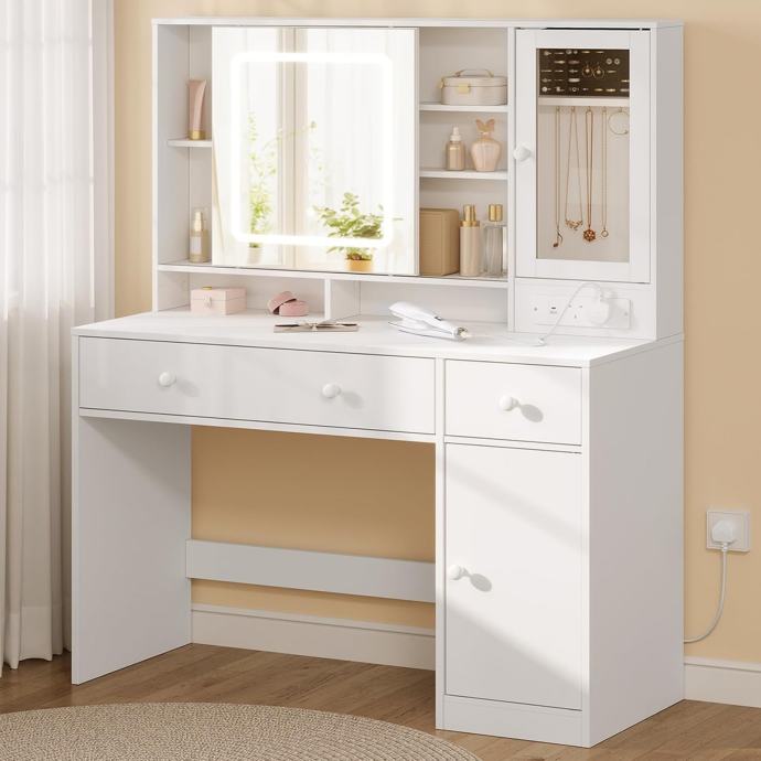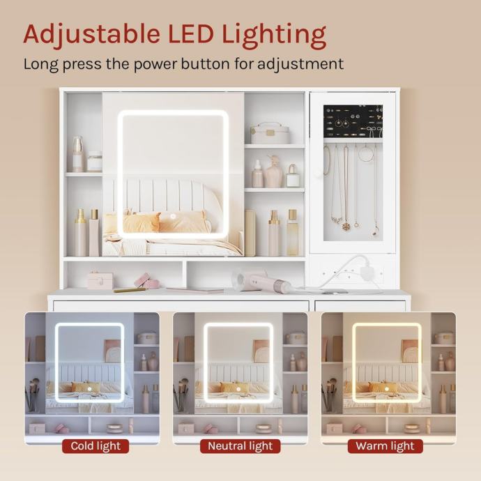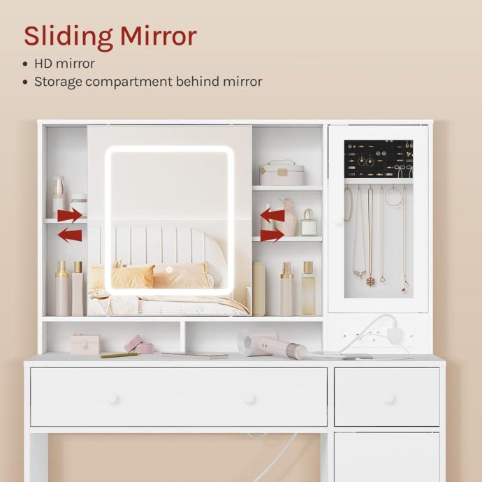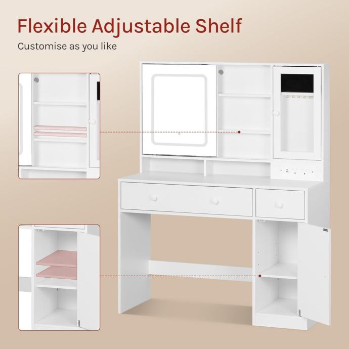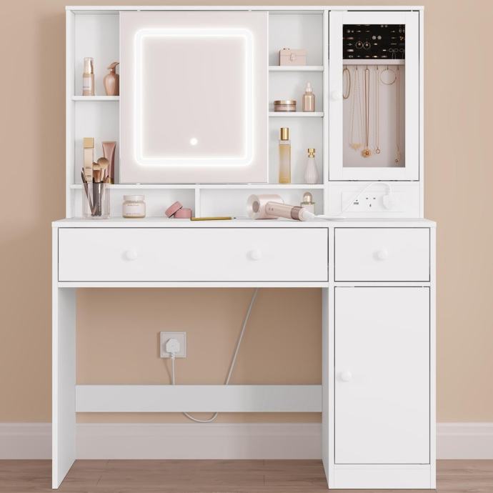 Bijeli toaletni stolić s punjačem, stolić za šminkanje s kliznim ogledalom, LED svjetla s mogućnošću prigušivanja, ladice, ormarić za nakit, bočne police, MB6125ws