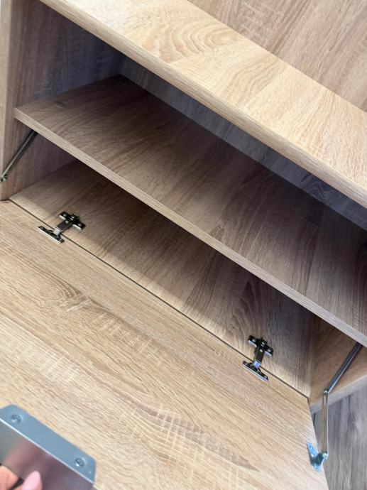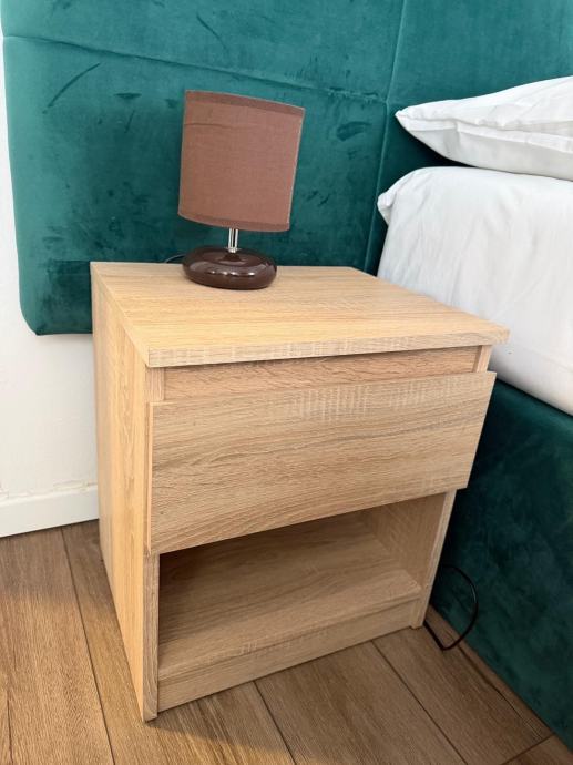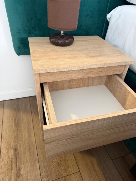 Noćni ormarići su u svijetloj boji hrasta, s jednom ladicom i otvorenom policom pri dnu. Dizajn je jednostavan i moderan, a ladice se glatko otvaraju i zatvaraju.