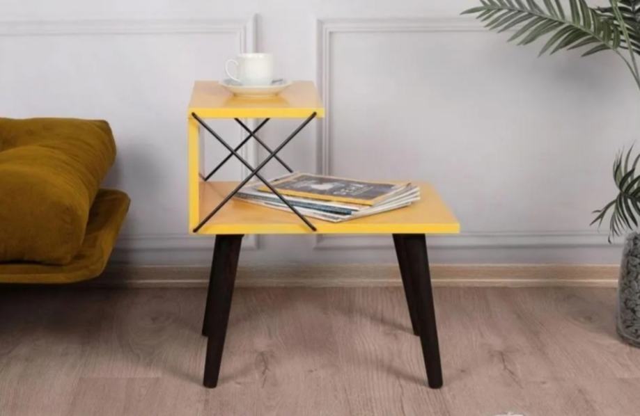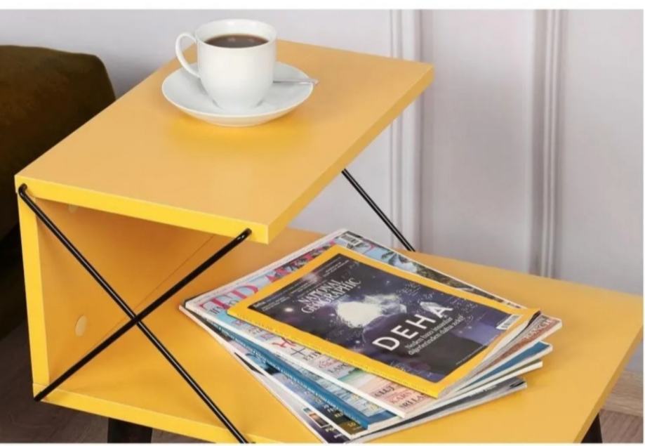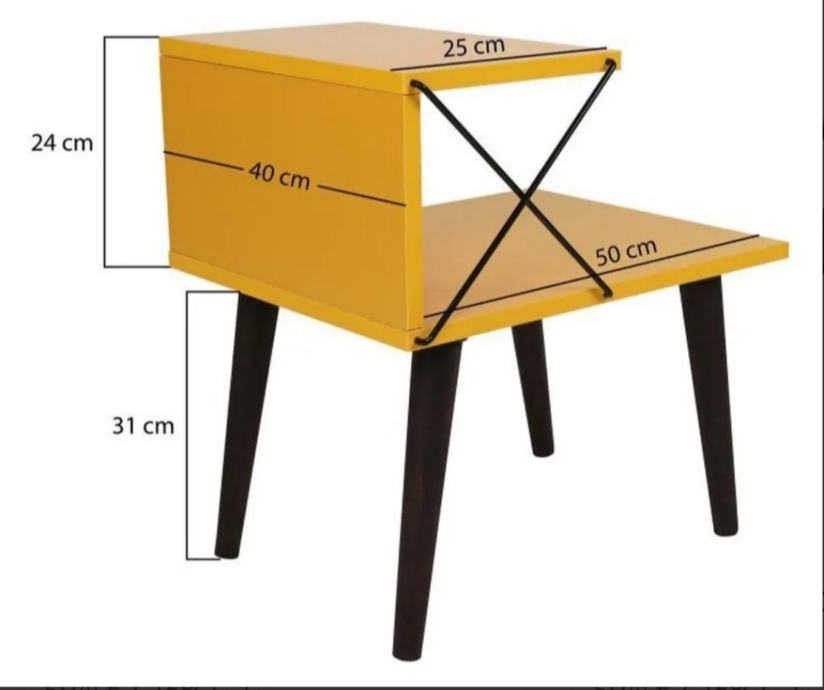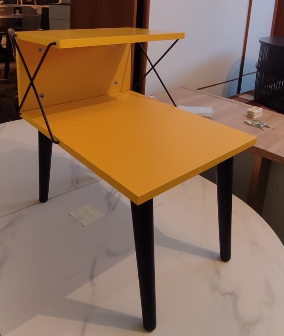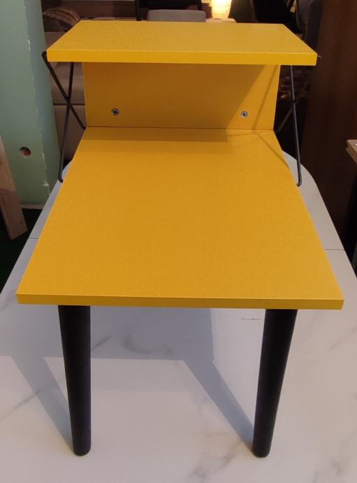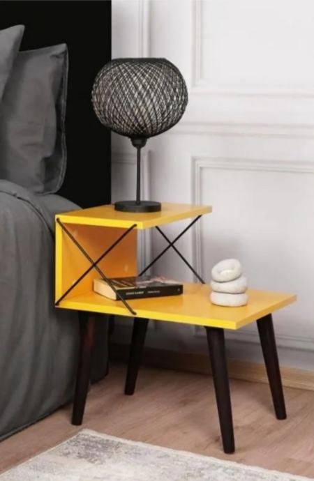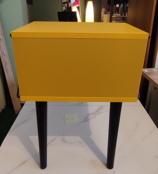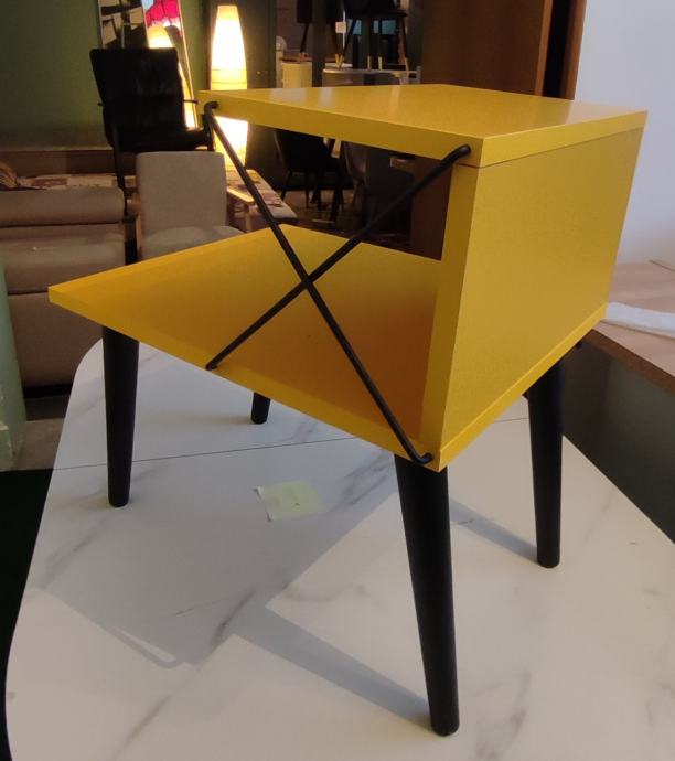 Prodajem potpuno novi noćni ormarić Cross u živopisnoj žutoj boji. Ormarić ima moderan dizajn s dvije radne površine i dekorativnim metalnim ukrasnim elementima u obliku križa na bočnoj strani. Izrađen je s crnim drvenim nogicama koje mu daju stabilan oslonac i elegantnu završnicu. Gornja i donja polica pružaju praktičan prostor za odlaganje knjiga, pića ili sitnih predmeta. Kombinacija žute boje i crnih elemenata čini ga zanimljivim komadnom namještaja koji može osvježiti spavaću sobu.
