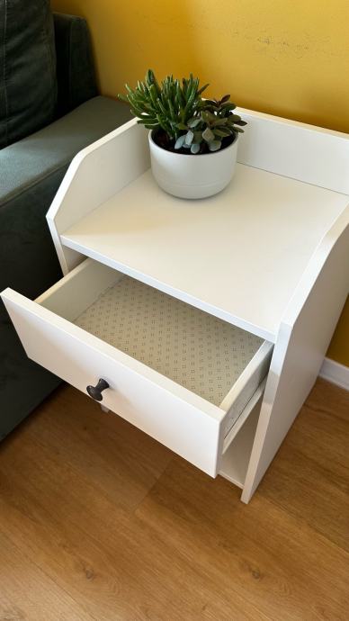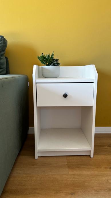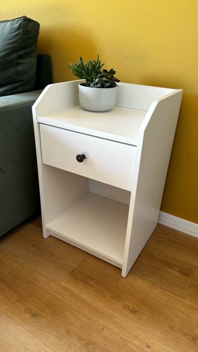 Prodajem novi noćni ormarić Ikea u bijeloj boji. Ormarić ima jednu ladicu s crnom ručkom te otvorenu policu u donjem dijelu, a gornja ploča ima blago uzdignutu stražnju stranicu koja sprječava padanje predmeta. Jednostavnog je i kompaktnog dizajna koji se lako uklapa u različite uređaje spavaće sobe.