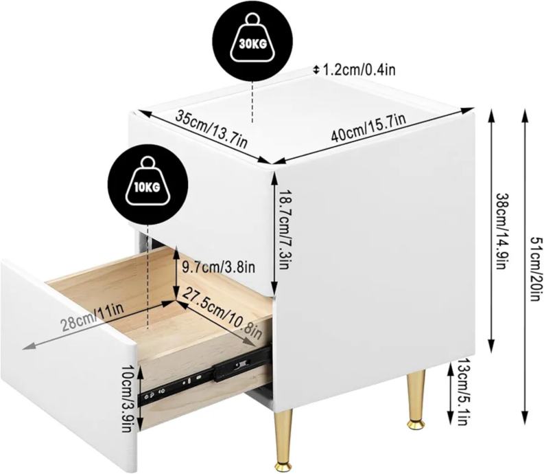 Noćni ormarić s 2 ladice, visoki sjaj, 35 x 40 x 51 cm, moderni noćni ormarić za spavaću sobu, jednostavna montaža, drvo PVC + metal, bijela + zlatna