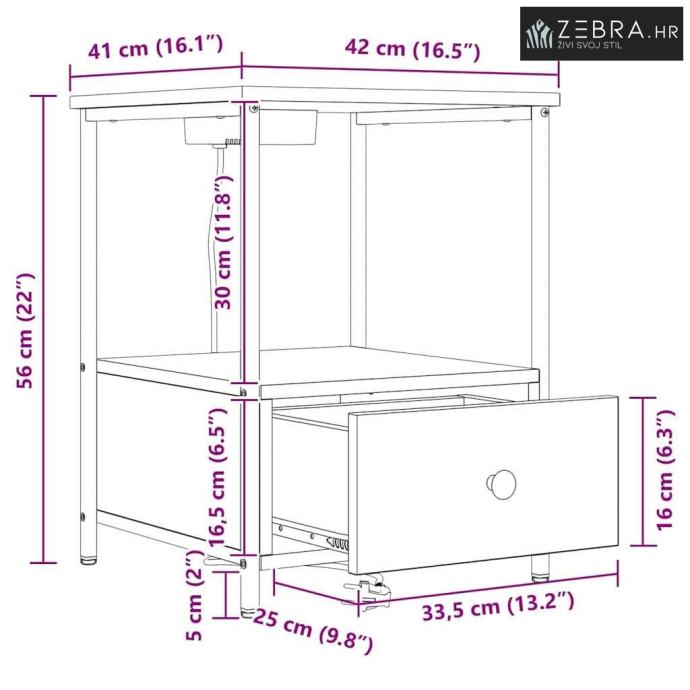 Materijali: Izrađen od kvalitetnog konstruiranog drva, ovaj ormarić ima prirodni izgled koji unosi toplinu. Ojačan čvrstim čeličnim kvadratnim nogama, nudi stabilnost i dugotrajnu podršku. Ova kombinacija jamči privlačnost i izdržljivost, čineći ga trajnim komadom za vaš dom. Uključeni dijelovi: Opremljen je sa dva tradicionalna ladice s elegantnim ručkama za jednostavno korištenje. Ladice nude prostor za pohranu osobnih stvari, osiguravajući uredan prostor. Uz praktičnu stanicu za punjenje, sve vaše bitne uređaje možete zadržati napunjenima kad god trebate. Karakteristike / Funkcija / Dizajn: Ovaj ormarić spaja funkciju i stil, nudeći rustikalni dizajn koji naglašava prirodnu ljepotu. Ugrađena stanica za punjenje smanjuje nered, a svestrani dizajn omogućava razne upotrebe — od pohrane do izlaganja dekoracija. Preporučena upotreba: Idealno za spavaće sobe kojima je potreban kompaktan, ali funkcionalan noćni stolić. Može poslužiti kao noćni ormar ili punjač, čineći ga korisnim kako za goste, tako i za stalne članove doma. Njegova rustikalna elegancija unapređuje svaku spavaću sobu. Njega i održavanje: Održavajte ovaj ormarić brišući ga vlažnom krpom. Redovito čišćenje pomaže očuvanju drva i osigurava da komada ostane važan deo vašeg dekora duže vrijeme. Boja: Dimljeni hrast