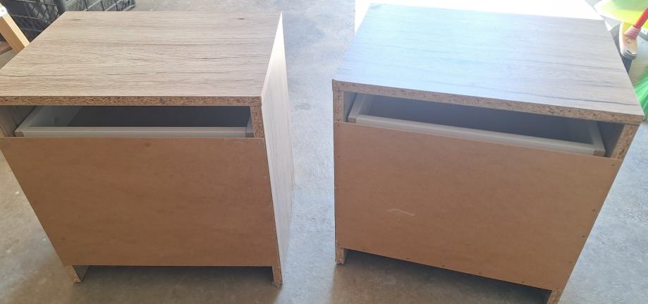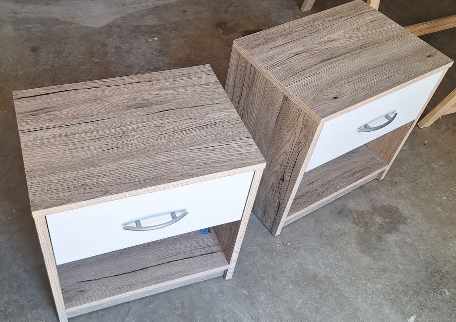Moderni noćni ormarići u kombinaciji drveta i bijele boje. Svaki ima ladicu i donju policu, praktični i idealni za svaku spavaću sobu.