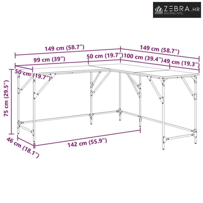 Ovaj L-oblika kutni uredski stol pruža prostran i elegantan radni prostor za moderne kućne urede. Ima glatke površine od konstruiranog drva i mat čelični okvir koji zajedno čine minimalistički stil. Njegov kvadratni oblik od 149 cm savršen je za više monitora i drugu računalnu opremu. Odličan izbor za posao i opuštanje.