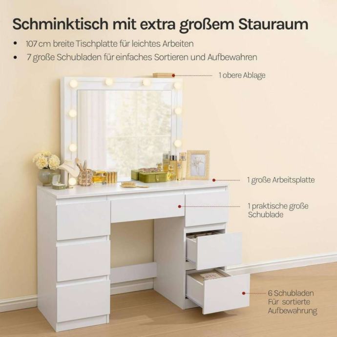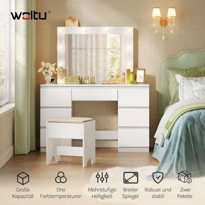 JEDNOSTAVNO SASTAVLJANJE: Pružamo ilustrirane, detaljne upute i sav potreban alat i pribor koji će vam pomoći u sastavljanju ovog toaletnog stolića s ladicama. Dimenzije: 107 x 140,5 x 39,5 cm. Napomena: Isporučuje se u 2 pakiranja.