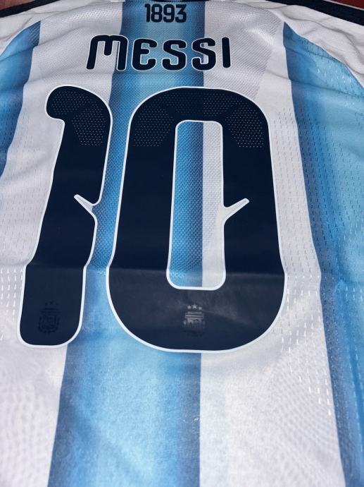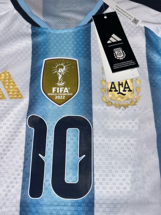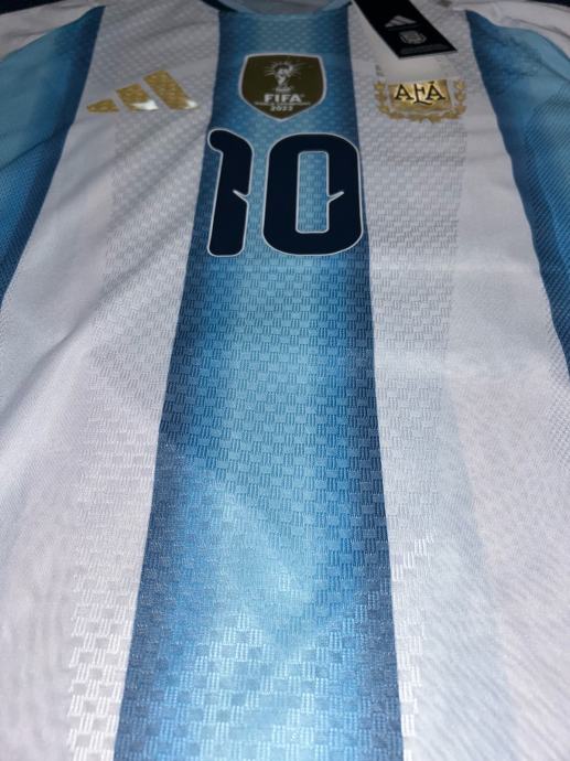 Prodajem dres argentinske reprezentacije s brojem 10 i imenom Messi na leđima. Dres je u prepoznatljivim bojama Argentine – plavo-bijele pruge s crnim detaljima na ramenima i rukavima. Na prsima se nalazi grb argentinskog saveza (AFA) i zlatna FIFA oznaka sa zvijezdom, što označava status svjetskog prvaka. Dres je proizveden od breathable materijala s perforacijama za bolju ventilaciju. Na leđima ispod broja piše "1993", a oznaka Adidas vidljiva je na više mjesta. Novo.