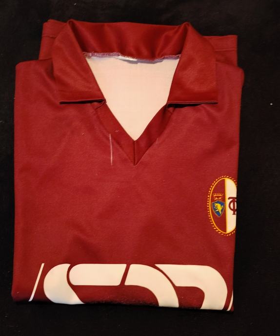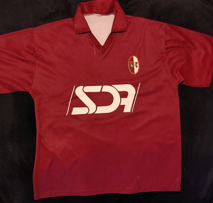 Prodajem nogometni dres talijanskog kluba Torino FC. Radi se o vintage dresu tamnocrvene boje s karakterističnim V-izrezom i ovratnikom. Na prednjoj strani nalazi se vezeni grb kluba, a ispod njega veliki bijeli sponzorski natpis SDA. Leđa su bez broja i natpisa.