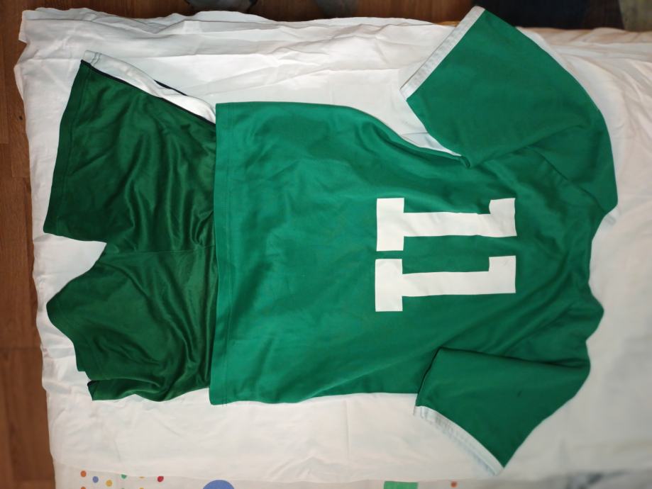 Nogometni dres juniorske ekipe Olimpija iz Ljubljane. Boja je zelena, grb originalan, a na leđima broj 11. Veličina small, proizvođač Sportika. Uz dres poklanjam i zelene juniorske gaćice proizvođača Jako. Cijena se odnosi na oba artikla. Osobno preuzimanje u Splitu ili šaljem poštom.