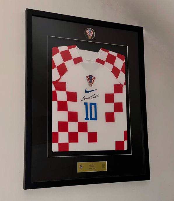 Uramljeni, originalni dres Luke Modrića s potpisom i certifikatom.