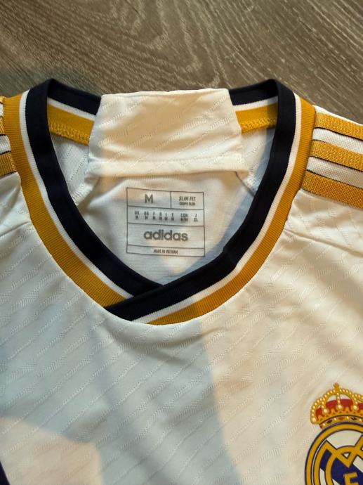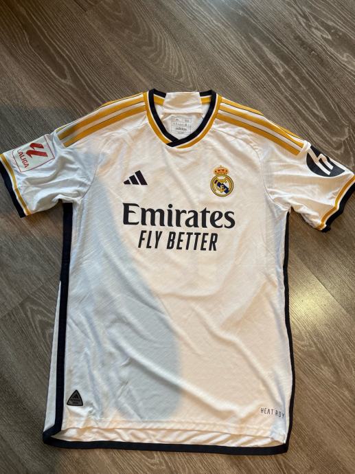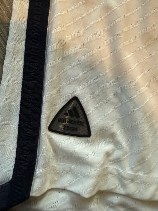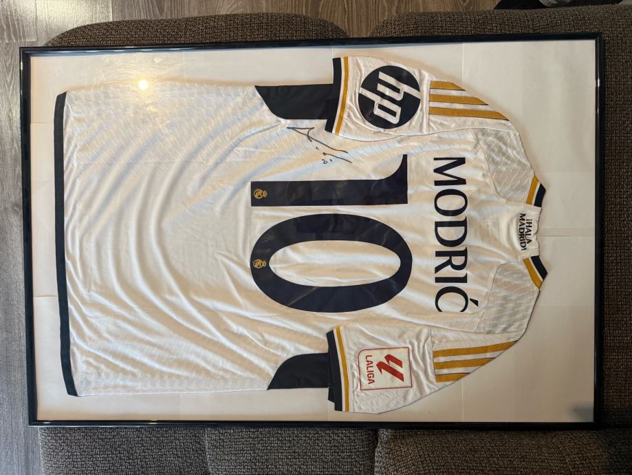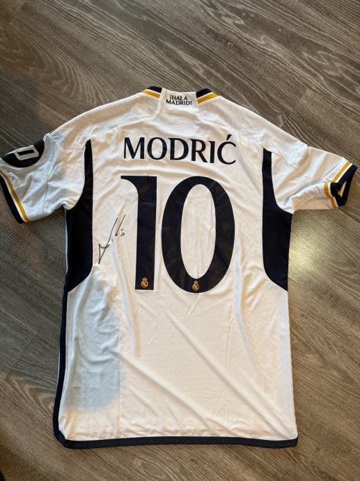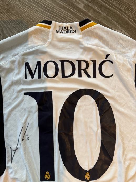 Prodajem dres Real Madrida s imenom i brojem Luke Modrića (broj 10). Radi se o Adidas Heat.rdy modelu u bijeloj boji s tamno plavim detaljima i zlatnim rubovima. Sprijeda se nalaze grb Real Madrida i Emirates sponzorski natpis, a straga je ispisan Modrićev prezime i broj 10 uz natpis "¡Hala Madrid!". Dres ima autogram na poleđini.
