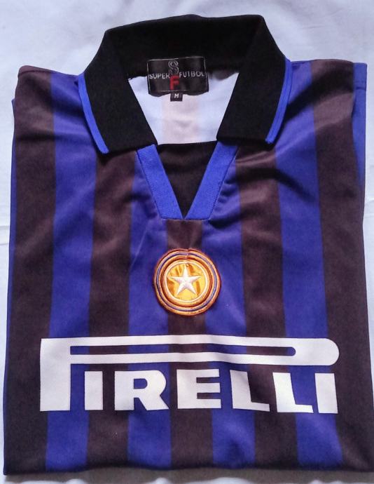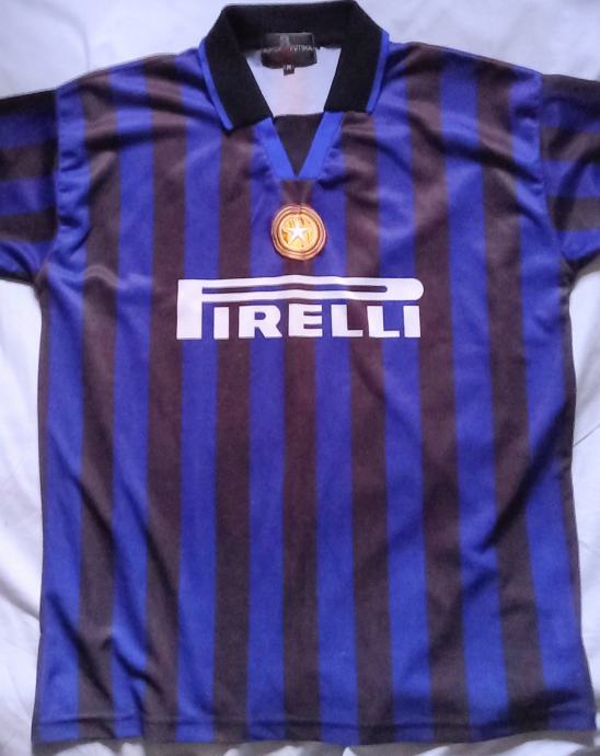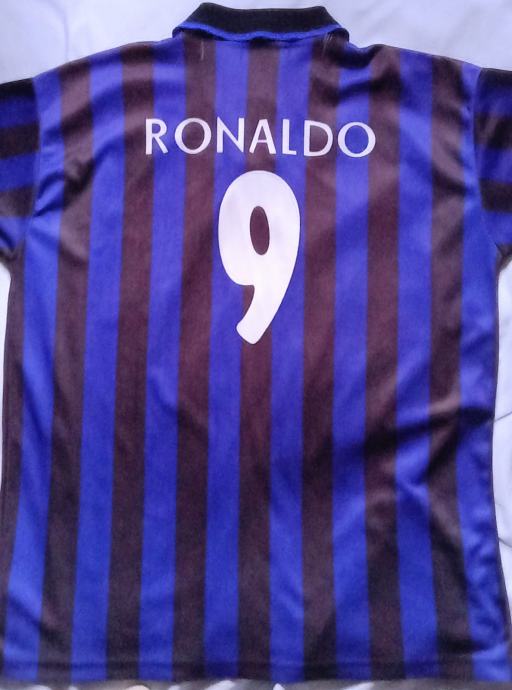 Prodajem retro nogometni dres Intera s Ronaldovim imenom i brojem 9 na leđima. Dres je u karakterističnim crno-plavim prugama s Pirelli natpisom na prsima i grbom kluba. Kragna je crna s V-izrezom. Veličina M.