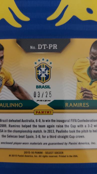 Prodajem rijetku Panini karticu brazilskih nogometaša Paulinha i Ramires u savršenom stanju. Kartica pripada Select Soccer kolekciji i sadrži originalne dijelove dresova oba igrača. Ograničeno izdanje s brojem 03/25 čini je pravim kolekcionarskim blagom za obožavatelje nogometa.