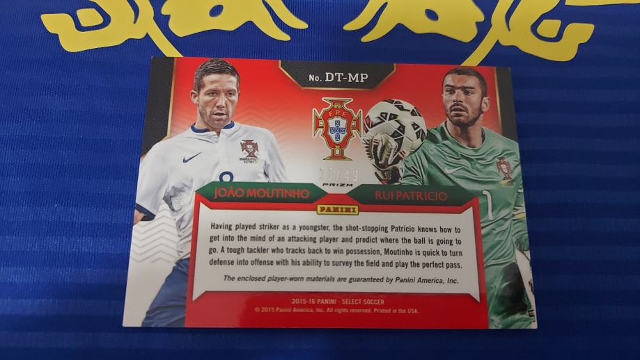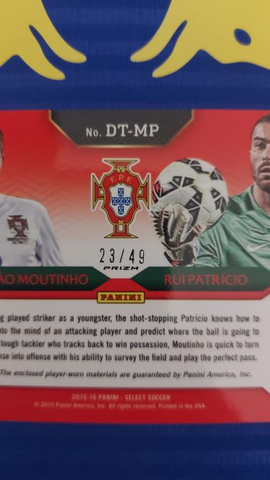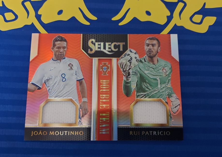 Prodajem potpuno novu nogometnu karticu s dijelovima dresa portugalskih reprezentativaca Joaa Moutinha i Ruija Patricija. Ova rijetka Select kartica ima ograničeno izdanje s brojem 23/48, što je čini pravim kolekcionarskim primjerkom. Kartica je u savršenom stanju, nikad korištena, samo bez originalne etikete.