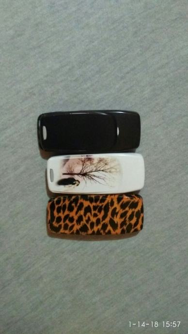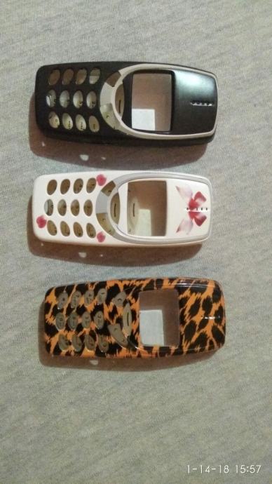 Korištene ali očuvane maske za Nokiu 3310. Crna i bijela sa masnicom naprijedi drvetom iza.